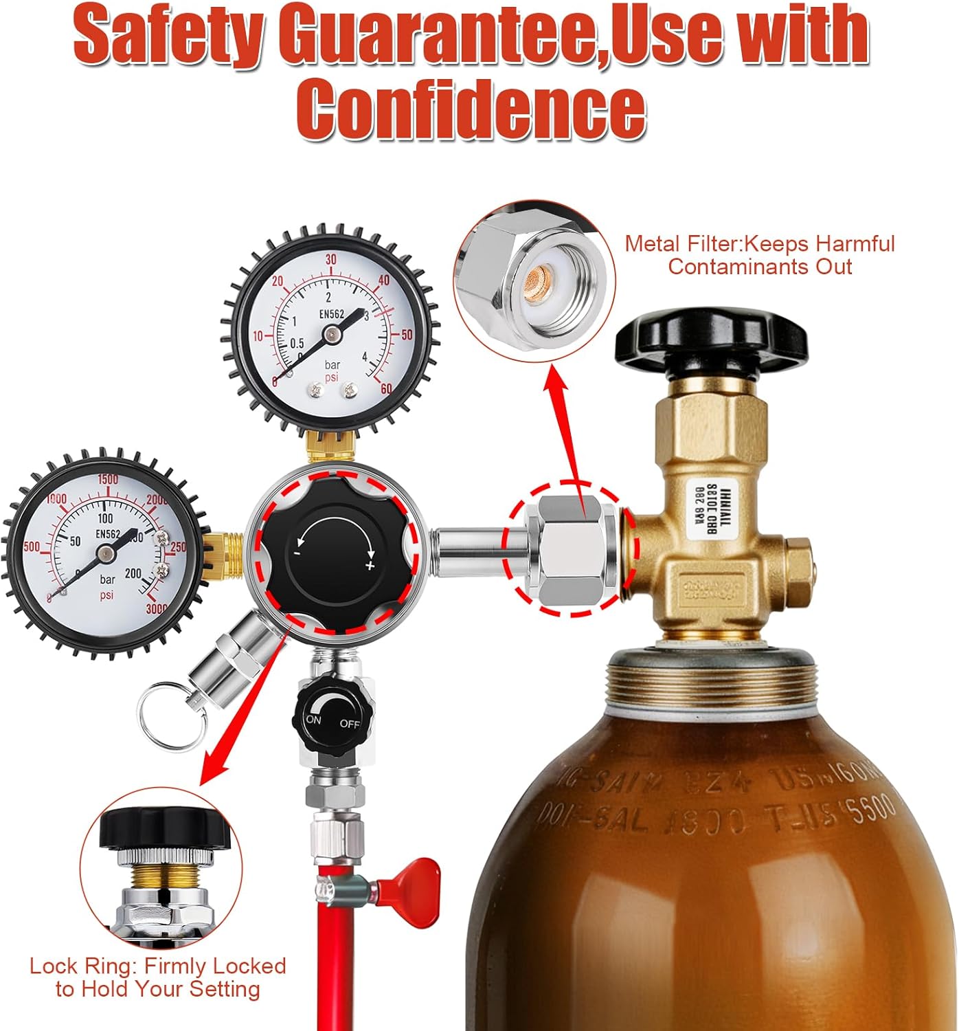 Eight Reasons to Choose Our kegerator pressure regulator: 1. Precise dual-gauge design: Equipped with both a CO₂ tank pressure gauge (0-3000 PSI) and an output pressure gauge (0-60 PSI) for clear, at-a-glance readings, enabling easy pressure monitoring. 2. Fine-tuned pressure control: The keg regulator co2 single tap features an adjustment knob that allows precise tuning of the CO₂ regulator’s output pressure, optimizing carbonation results. 3. Shockproof & durable build: The shockproof case protects the gauges effectively, enhancing the overall durability of the device. 4. Wide compatibility: Works with CGA320 CO₂ tanks; the output side has a 5/16” barb fitting (suitable for hoses with 1/4" or 5/16" inner diameters) and 3/8" quick-connect fittings, ideal for homebrewing, draft beer systems, and beverage carbonation. 5. Automatic pressure relief for safety: Built-in pressure relief valve automatically releases excess pressure (around 50 PSI); the valve can also be pulled manually to adjust pressure, ensuring safe operation. 6. Durable brass components: Core parts of this corny keg co2 regulators are made of brass, delivering stable performance and a long service life. 7. Leak-proof sealing design: The dual gauge co2 regulator comes with 2 stainless steel hose clamps and thickened O-rings to enhance sealing, preventing gas leaks. 8. Quick shut-off & backflow prevention: The shut-off knob instantly stops CO₂ flow while preventing liquid from backflowing into the gas line, making operation convenient and protecting the pipeline. What’s in the box? 1 x keg co2 regulator 2 x Stainless Steel Hose Clamps 2 x Gaskets Upgrade your kegerator or homebrew setup with this heavy-duty kegerator regulator single, designed for precise control and reliable performance. Featuring a dual-gauge system, it allows you to monitor both CO2 tank pressure (0-3000 PSI) and output pressure (0-60 PSI) at a glance. The auto pressure relief valve ensures safety by releasing excess pressure at around 50 PSI, while the manual pull-release function lets you fine-tune adjustments as needed.