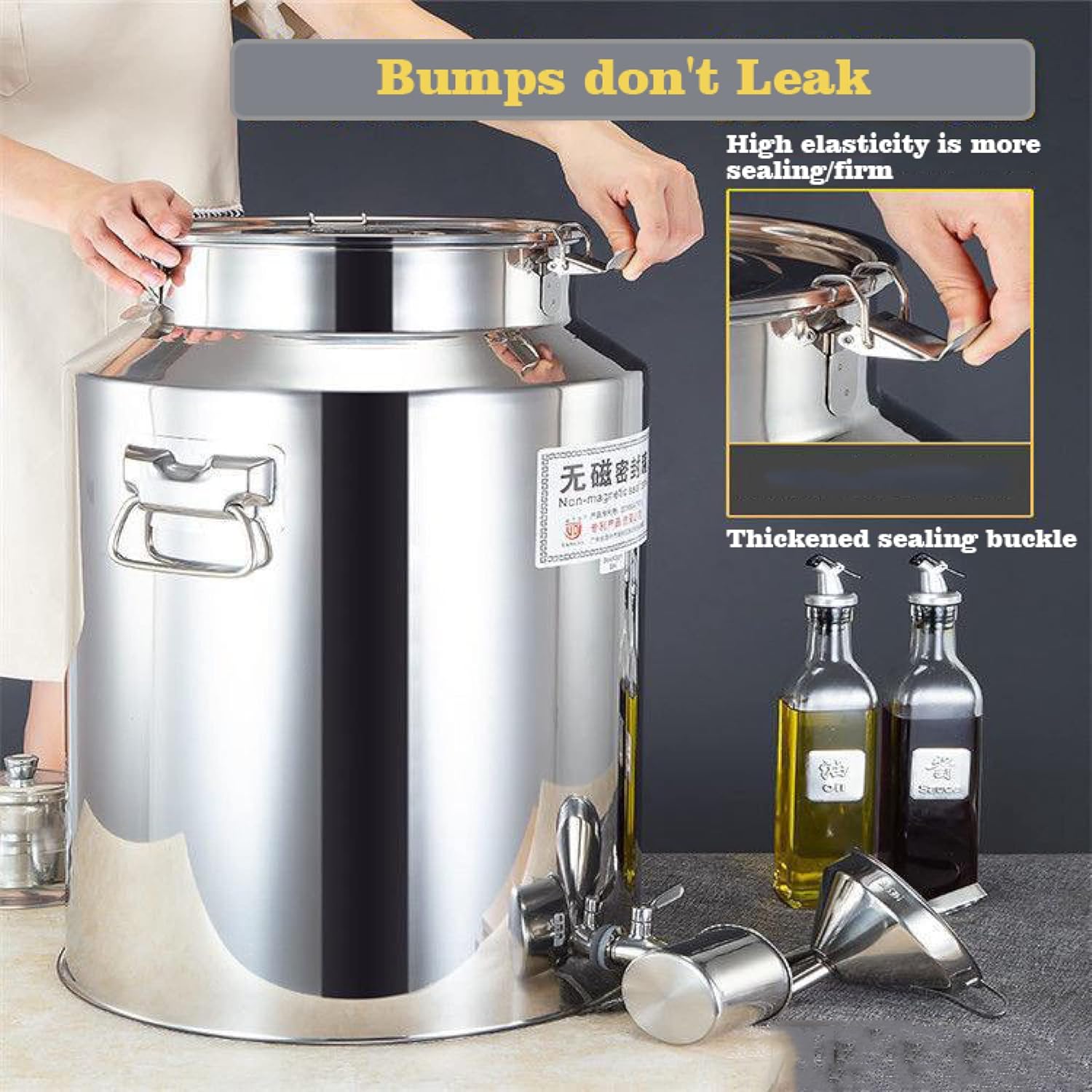 Made of 201 stainless steel with a smooth mirror-polish finish, our stainless steel milk can is anti-rust, anti-corrosion, dent-resistant, and ready for use in any environment for a long time. The sealed lid with one food-grade silicone gasket is tightly secured by three latch buckles, no need to worry about milk or oil spillage even when the bucket is inverted. Feel free to carry milk in this milk jug back and forth from the barn to your house.SpecificationsCan Material: 201 stainless steelLid Gasket Material: SiliconeCapacity: 5L/9L/14LThickness: 0.04"/1 mmSize:5L: 17x24cm/6.7x9.4inchOil quantity: 2.5keWater eapacity: 2.5kgAlcohol: 2.5kgTea eapacity: 0.5kg9L:22x24cm/8.7x9.4inchOil capacity: 5kgWater eapacity: 6kgWine capacity: 5.5kgTea capacity: 1.5kg14L:22x32cm/8.7x12.6inchOil capacity: 8kgWater capacity: 12kgWine capacity: 11kgTea capacity: 1.5kgPackage Content:1 x Stainless Steel Milk Storage BucketWe hope to give you a good shopping experience, any questions can be emailed and we will deal with them within 24 hours.