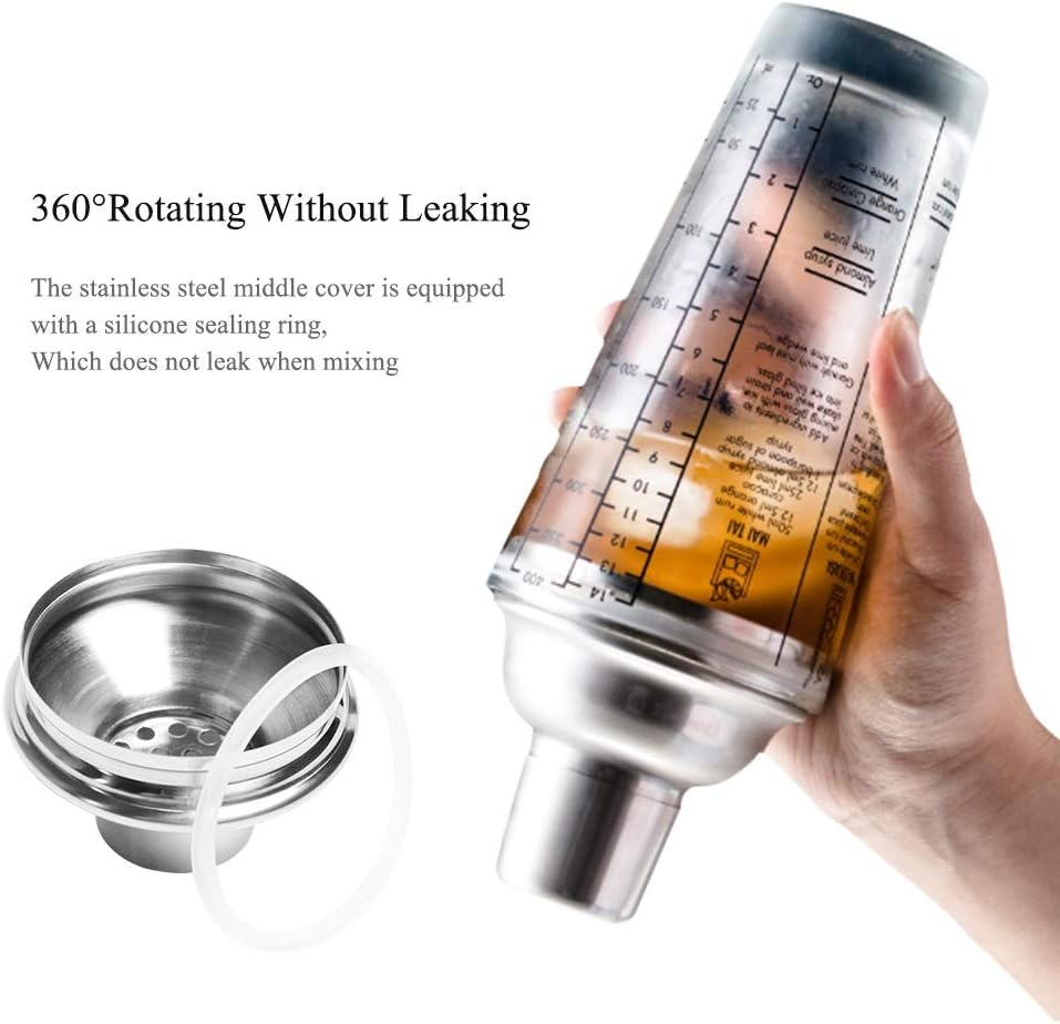 The top cover and cover are made of 0.6mm stainless steel with high thickness, the glass is 3mm thick. Outside surface throwing, even drawing inside, even noble quality;Made of 304 stainless steel, safe and friendly;The stainless steel nozzle with small hole design can effectively filter the in the cup;The cup body made of high transparent glass is exquisite, and the scale of the generous cup body is visible;The stainless steel middle cover is equipped with a silicone sealing , which does not leak when mixing;More than just a cocktail glass, can also be used as a measuring cup; and beautiful, it can be used at home, bars and other occasions. It is a good for a gift.Specifications:Material: Stainless steel + GlassColor: as shownCapacity: 350ml, 400mlSize: 215*87mm, 225*92mmNotes:1. Due to the different monitor and light effect, the actual color of the item might be slightly different from the color showed on the pictures;2. Please allow 1-3cm measuring deviation due to manual measurement.Package Contented:1 x Cocktail ShakerHighly practical with all-in-one bartending tools, it suits both beginners and seasoned mixologists, is easy to use and clean, for daily use, and also serves as gift for cocktail lovers, any home bar setup and drink-making experience