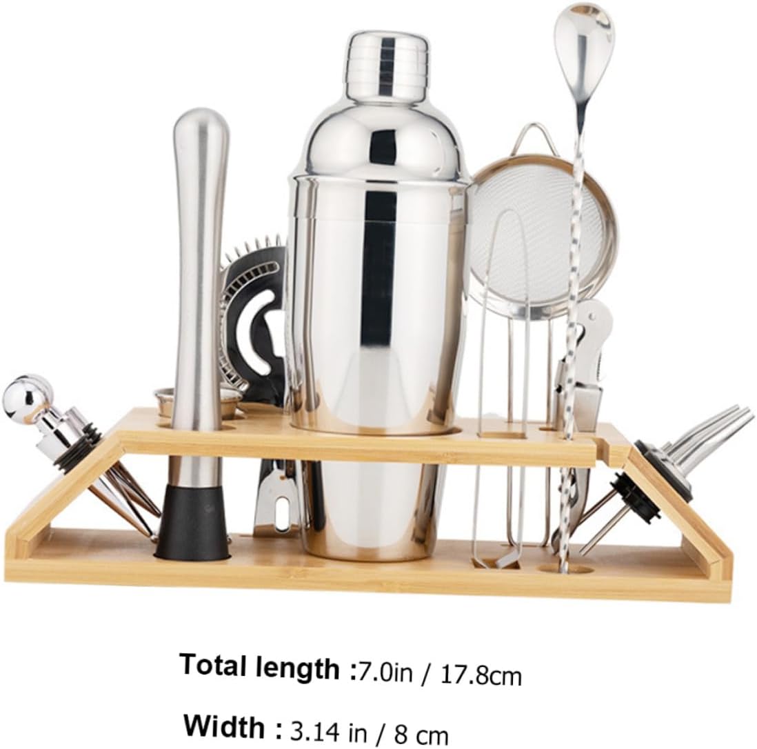 Package List 1 x Set of 13Pcs Cocktail Shaker Tools Characteristics -Product Info:Bartender set - Material: Stainless steel, Household Cocktail Tools. - Shaker Strainer Size: Approx. 17.80X8.00X2.00cm/7.00X3.14X0.79in Cocktail Tools. - Color: Silver Home Cocktail Tools. - Comes with a rack for the storage of these cocktail tools Bar Cocktail Tools. - This cocktail tool set is a set that is a favorite of expert bartenders Beverage Making Tools. - It can be used in multiple functions, which can bring much convenience to you Versatile Cocktail Shaker. - This is a professional introductory cocktail shaker set that can be used for yourself, or as a gift for those who love liquor Stainless Steel Bar Tools. - It fits comfortably in your hand and is easy to hold and features a good balance between light and weight. Bartender KitGoods InformationHousehold Cocktail Tools and fine polished, rust and scratch resistant.Cocktail Strainer Whether you're a beginner interested in cocktails or a professional cocktail mixologist, this cocktail tools set is the for you.Bar Accessories It is easy to clean by hand, and it will stay clean after use without any stains