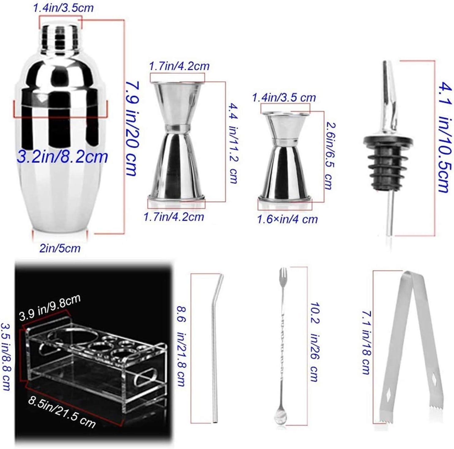 SPECIFICATION: Material:304 stainless steel Size: wine shaker: 3.2×7.9in/8.2×20 cm wine mouths:4.1 in/10.5cm Small rim measuring cup:1.6×1.4×2.6 in/4×3.5×6.5 cm Large-sized measuring cup with winding edge:1.7×1.7 ×4.4 in/4.2×4.2×11.2 cm Stainless steel ice clamp: 7.1 in/18 cm Stainless steel bar spoon:10.2 in/26 cm stainless steel strawsTransparent:8.6 in/21.8 cm acrylic receiving bracket:8.5×3.9×3.5 in/21.5×9.8×8.8 cm Color:silver Package includes: 1 ×550ML wine shaker, 3 ×wine mouths 1 ×Small rim measuring cup, 1 ×Large-sized measuring cup with winding edge, 1 ×Stainless steel ice clamp, 1 ×Stainless steel bar spoon, 4×stainless steel straws 1 ×Transparent acrylic receiving bracket Although the order is over, our service is not over yet. Yours is definitely the biggest motivation for me. If you have any questions, please feel free to contact us, we will serve you wholeheartedly.