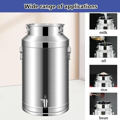 This 304 stainless steel milk jug is a robust, durable, and versatile storage solution designed to meet all your liquid and dry goods storage needs. Made from 304 stainless steel, it boasts superior rust and corrosion resistance, making it ideal for long-term use in homes, restaurants, farms, and other commercial settings. A silicone gasket and three stainless steel latches ensure a tight seal, so you don't have to worry about leaks even during bumpy road transport. A stainless steel faucet allows for easy and clean access to milk, wine, oil, or water, preventing waste. The smooth stainless steel surface and wide opening make cleaning quick and easy—simply rinse and dry. Whether you need to store milk, ghee, wine, oil, rice, flour, or dried chili peppers, this 35-liter milk jug's extra-large capacity will meet all your needs. It's also perfect for dairy farms, restaurants, and even home storage.
