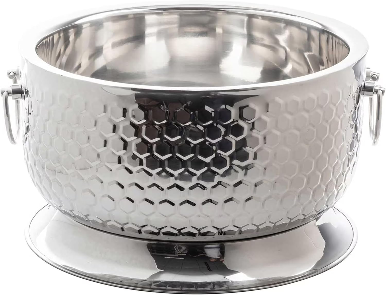 Upgrade beverage service with the TableCraft 12851 Hive Collection Round Beverage Tub, designed to combine striking presentation with dependable performance. This round beverage tub features a spacious 4.5 gallon capacity, allowing operators to stock bottled and canned drinks generously while reducing the need for constant refills. The elevated base adds height and structure to beverage stations, helping drinks stand out while keeping service areas organized and visually appealing. A bold honeycomb texture paired with a mirrored finish reflects surrounding light, giving this textured beverage tub a refined, modern look that enhances buffets, parties, catered events, and banquet settings. Constructed as a stainless steel beverage tub, this piece delivers durability and long-lasting use while maintaining an upscale appearance suited for front-of-house display. Its versatile size makes it ideal for soda, beer, water, or chilled beverages on ice, while the smooth interior supports efficient service. Designed as a dishwasher safe beverage tub, cleanup after events is fast and efficient, helping staff reset quickly between services. As part of the Hive Collection, this TableCraft beverage tub integrates seamlessly with coordinating pieces, allowing operators to build cohesive drink stations anchored by a commercial beverage tub that elevates both function and style. Item Details: Dishwasher safe Stainless Steel (14-1), mirror finish Textured honeycomb design Coordinates with the full Hive Collection for a cohesive display