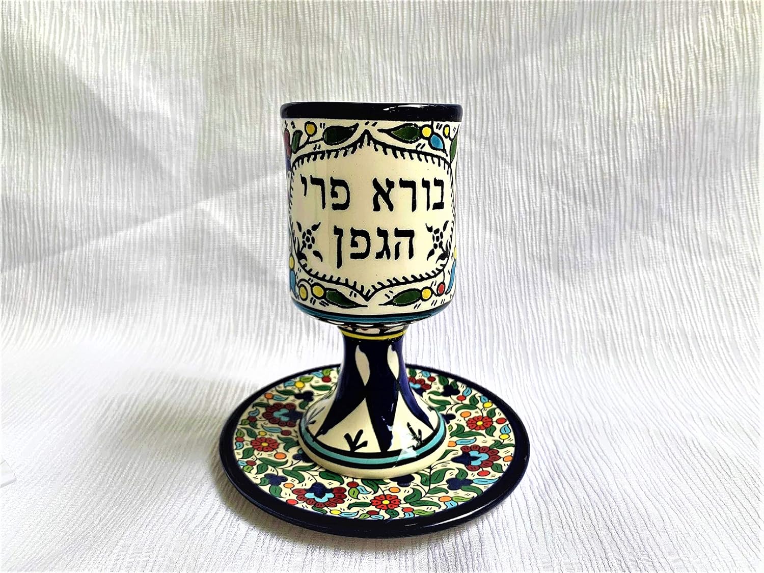 Amaizing Armenian Ceramics Kiddush Cup with Plate Design Maroon Floral Theme & Blessing Words Height: 5.3" / 13.5 cm Diameter of saucer: 5.1" / 13 cm This beautiful cup will add a touch of beauty to your Sabbath table! It features the Hebrew words from the blessing over wine Borei Pri Hagafen ("He who creates the fruit of the vine") surrounded by a colorful פרחוני motif matched by the included saucer. Manufacturing Process: Each individual item is hand made with ceramic clay. Once complete it is placed in an oven at temp. 1000°C until hardened. Each piece is then hand painted using metallic and oxidized paint in order to keep its natural color. Again it is returned to the oven at the same temperature and finished with fine glazing. Ceramic Kiddush Cup and Plate In popular Armenian design Blue and maroon floral theme Wine blessing printed on cup This ceramic Kiddush cup with matching plate is sure to make your Shabbat table especially attractive. The tasteful design represents the popular Armenian style with its intricate flower theme in distinctive blue and maroon colors. In the center of the cup is boldly written in Hebrew the words Borei Pri HaGofen – an extract from the wine blessing. MATERIAL Ceramics MEASUREMENTS Height: 5.4" / 13.5 cm