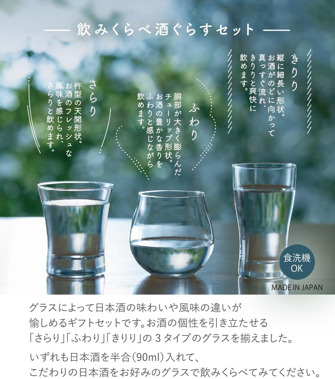 This gift set allows you to enjoy the difference in taste and flavor of Japanese sake. 3 types of glasses that complement the personality of your liquor: smooth, soft, and crispy. The 3 types of glasses are suitable for holding half (3.4 fl oz (90 ml) of Japanese sake. Please try drinking your favorite Japanese sake. The pepper shape is a pestle shape, so you can feel the fresh flavor of your liquor, and drink it quickly. The fluffy tulip shape has a large body that allows you to enjoy the rich fragrance of your liquor. ● The scoop's vertical and elongated shape allows the drink to flow straight toward the throat, allowing you to drink refreshed. The back of the wooden box lid comes with a printed "explanation of the glassware features, making it a great gift idea. Dishwasher safe for easy daily cleaning. Recommended as a gift for your loved ones, or for commercial use in restaurants and restaurants, etc.