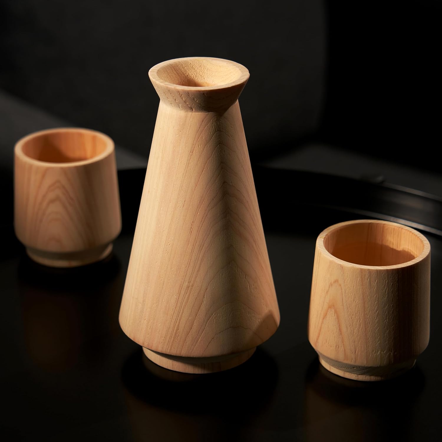 Crafted from authentic Japanese Hinoki cypress, this sake set evokes traditional wooden sake vessels. Its delicate pine and eucalyptus fragrance elevates the sake experience. With a modern design, it's ideal for contemporary sake enthusiasts. Includes 2 cups and 1 carafe, made from Japanese Hinoki cypress wood, with capacities of 3 oz. and 10 oz. respectively. Care instructions: rinse and pat dry.