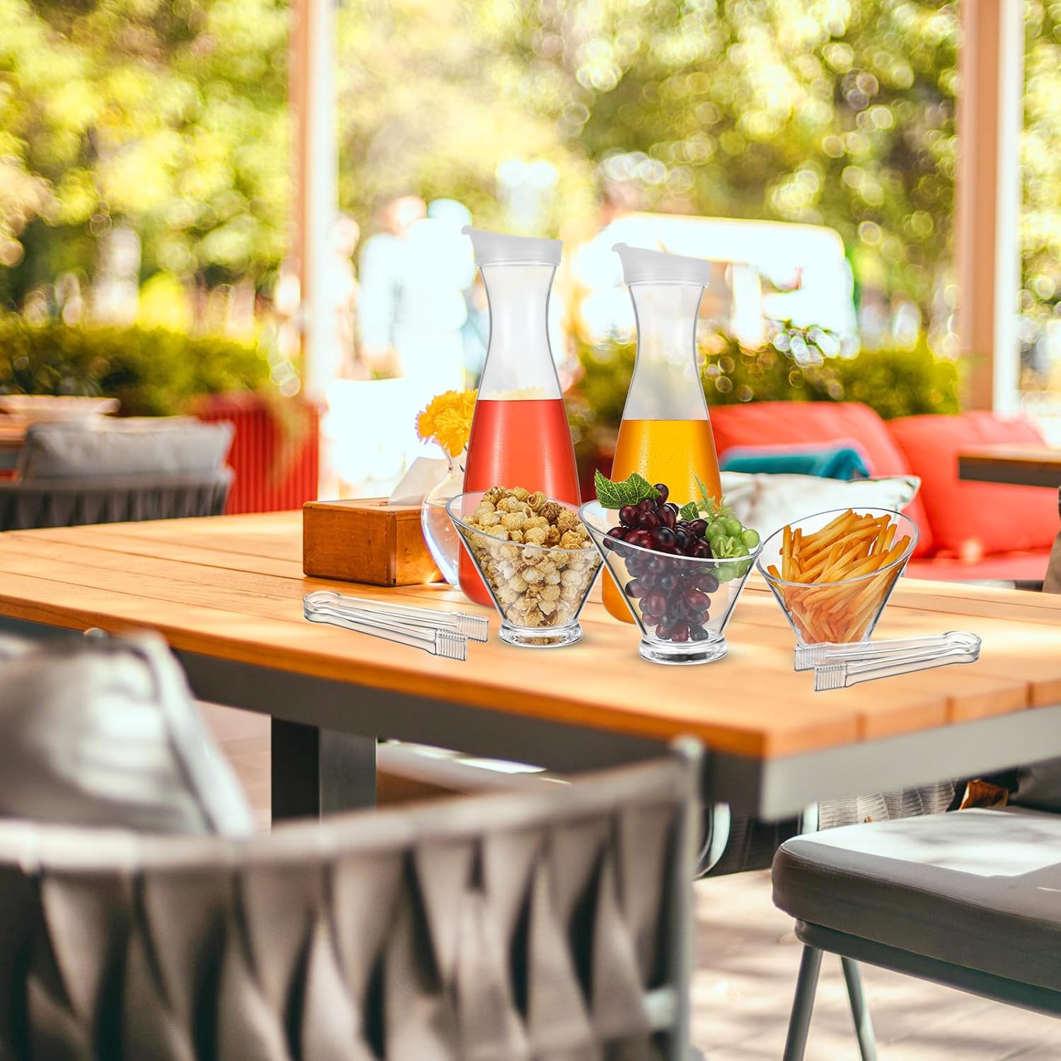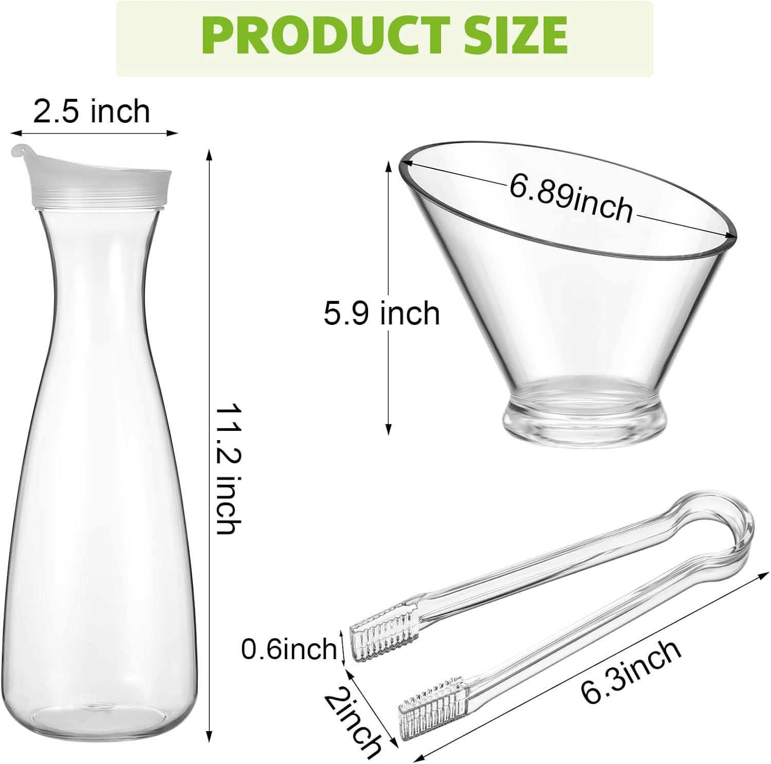 Features: Ideal choice: The plastic carafe's spacious design allows for easy addition of ice, fruit, or tea bags, ensuring your beverages stay chilled and flavorful. Specifications: Material: plastic Color: clear Size: (about) Plastic water carafe with lid: 47 oz Salad bowl: 6.89 x 5.9 inches Plastic buffet serving Tong: 6.3 x 2 x 0.6 inches Package includes: 4 x Plastic water carafe with lid 6 x Salad bowl 6 x Plastic buffet serving tong Notes: Manual measurement, please allow slight errors on size. The color may exist a slight difference due to different screen displays.