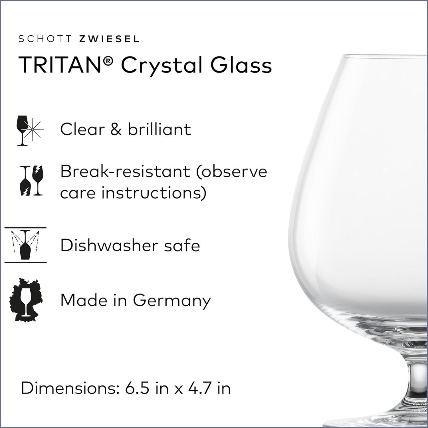 SCHOTT ZWIESEL Cognac glasses Bar Special - design and function for the professional.Every moment deserves to be celebrated in style. Whether at a picnic for two, alone in the bathtub with a good book, at a pizza party or when partying together: the SCHOTT ZWIESEL cognac glasses are the perfect match. The large, rounded cognac glasses are ideal for cognac, armagnac or brandy and offer a stylish moment of enjoyment with their classic design. Made from Tritan crystal glass, the bar glasses are particularly durable and dishwasher-safe.Features:Height: 6.5 inDiameter: 4.7 inColor: CrystalStructure: SmoothBreak- and dishwasher-safeTritan crystal glassMachine-blownMade in GermanyGlass set especially suitable for: Cognac, Armagnac, BrandyBar Special Collection:The Bar Special series from SCHOTT ZWIESEL offers the right glass for every occasion: whether for an aperitif or digestif, a fine glass of wine or water and even for a wide variety of cocktails. Thanks to their elegance and suitability for everyday use, the bar accessories in the Bar Special range are not only suitable for professionals, but also look great in any home.