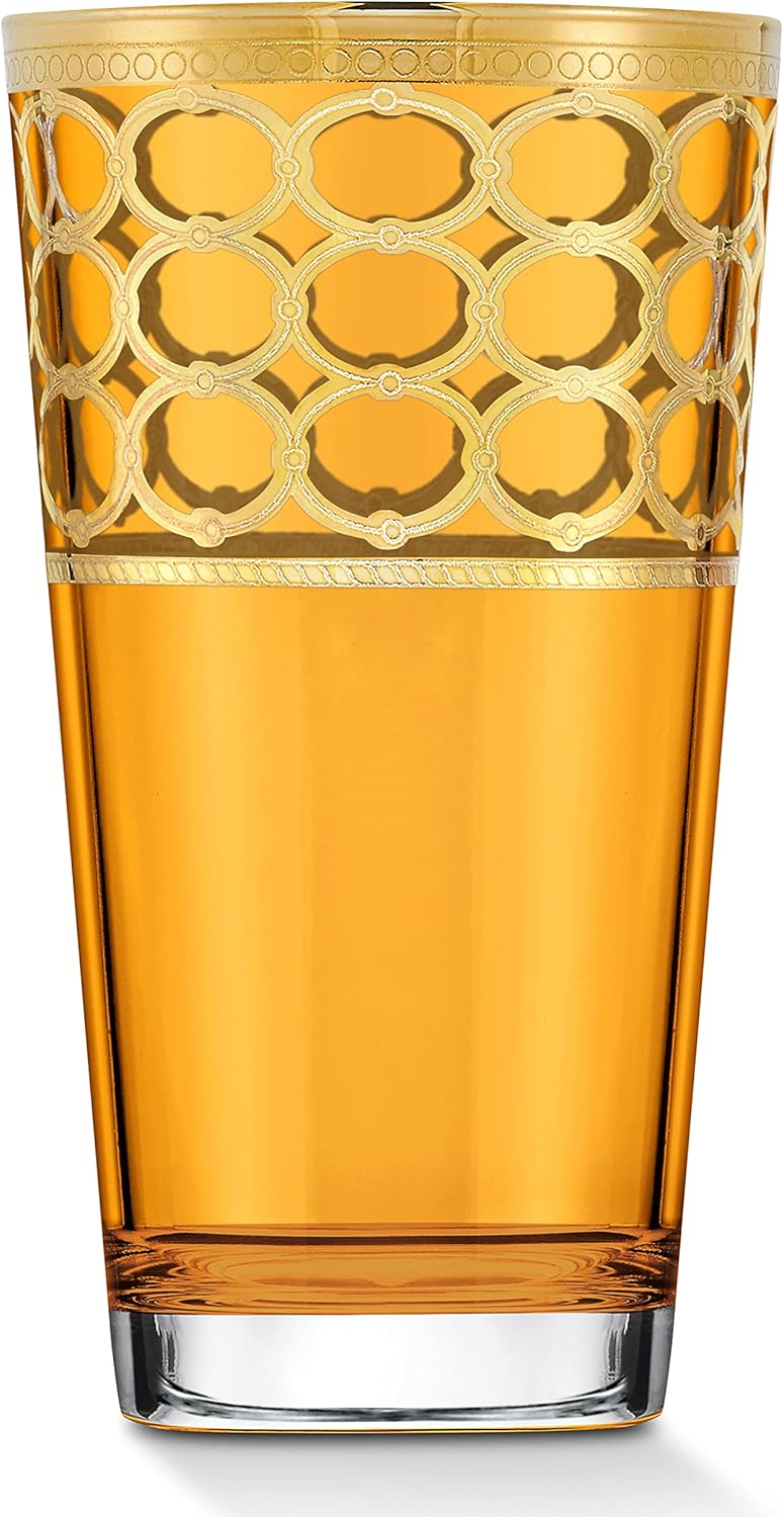 This Amber Gold Ring Collection from Lorren Home Trends is a magnificent marriage of style, hand craftsmanship, and attention to detail and design. Each individual glass is hand embellished and crafted in 24K gold to create a delicate and unique look. The Design is a stack of 3 gold band of rings fused together. Lead free crystal glass. These set of 4 tumblers are crafted for teas, water, cocktails, or any drink of your choice. Each glass measures 2.75"x2.75"x5.5" and holds 11 ounces. Each glass weighs .69