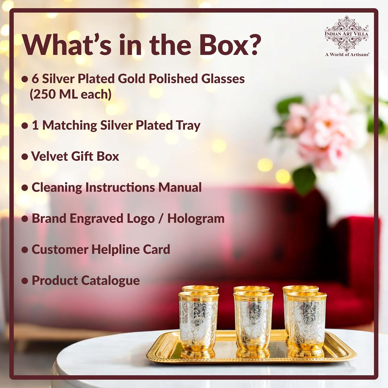 IndianArtVilla Silver Plated items have antique designs. The item is highly durable, elegant and a wonderful addition to your Home Decor. It comes in a Fancy red/blue colored gift box and can be readily turned into a wonderful Anniversary, Wedding, Diwali, Valentine gift item. CARE TIPS Dusting - First, use a soft brush or clean cotton cloth to dust. Removing Candle Wax - Candle wax can be removed from a silver holder by simply running hot water over the area containing the wax. The softened wax should be easy to pry out with a finger. Never risk scratching the piece by using a knife or other sharp object. Washing and Drying - Once all dust and wax are removed, wash the item by hand with warm water and a gentle dish washing soap to remove any food but don't soak the silver in water for any length of time. Rinse the piece well with clean water, distilled is best, and dry immediately with a soft, lint-free cloth. A hair-dryer set on warm helps to dry hard-to-reach places. After your pieces are clean and completely dry, wrap each of them individually with acid-free buffered tissue, butter paper or washed cotton, linen, or polyester to store. Do not use woolor newspaper, which can cause excessive tarnishing that will be difficult to clean, or even worse can remove silver plating. Safely Display Silver Plated items in Your Home - If you'd like to display your silver plated items rather than storing it, a glass-enclosed cabinet makes a good choice. Avoid unvarnished wood shelves that can omit harmful vapors and can cause tarnishing.Glass shelves are preferred over wooden shelves.You'll have to avoid displaying or storing silver near cotton felt, wool or velvet as well.
