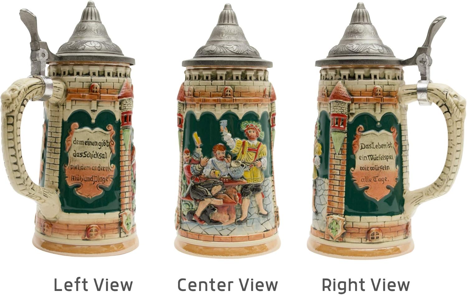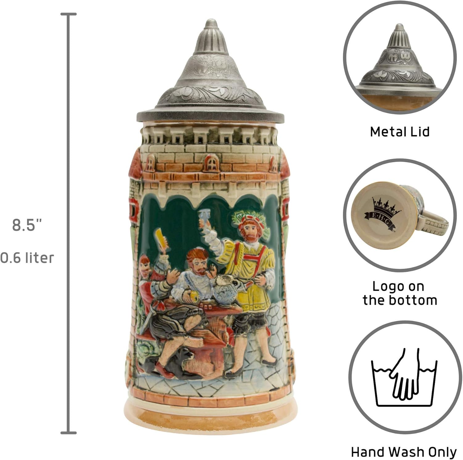 Presenting the Oktoberfest Haus beer mugs for men, a perfect gift for the beer lover in your life. This beer mugs and steins is a premier beer lovers gift, boasting a Castle Festive Scene that transports one to the heart of a traditional German festival. Beyond being a mere beer mug, this beer stein is a work of art, adorned with an ornate metal lid that adds a touch of elegance and authenticity. It embodies the spirit of a classic beer stein, making it a great addition to any collection of beer mugs & steins. The traditional German design will appeal to beer fans who appreciate the aesthetics of a beer stein with lid. This large stein mug can accommodate generous servings of your favorite brew, making it a fantastic addition to any beer-drinking occasion. The mug lid ensures that your beer remains fresh, making this beer mug with handle a practical and stylish choice. For those interested in German culture and aesthetics, this beer cup with lid is a must-have. The detailed Castle Festive Scene, reminiscent of a classic Deutschland beer stein, captures the essence of German tradition. This German stein mug is a perfect embodiment of the German bier krug, making it a great beer lover gift. This stein beer mug is not only functional but also a collectible item. It stands out among collectible beer steins with its intricate design and high-quality materials. The ceramic mug with lid is durable and easy to clean, making it a convenient addition to your barware collection. This beer mug gift is perfect for beer enthusiasts who appreciate the history and tradition behind their drinks. Whether it's for a birthday, Christmas, or simply as a token of appreciation, the Oktoberfest Haus Beer Stein is a gift that will be cherished.