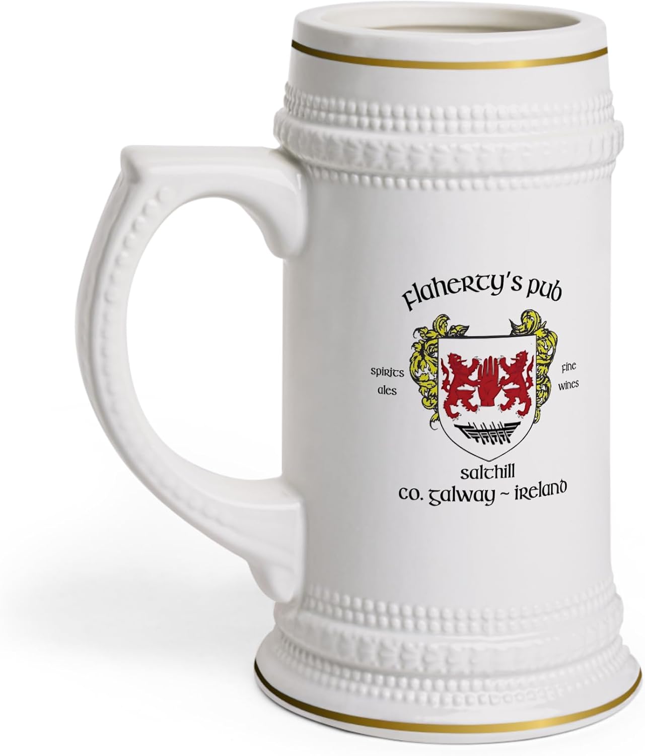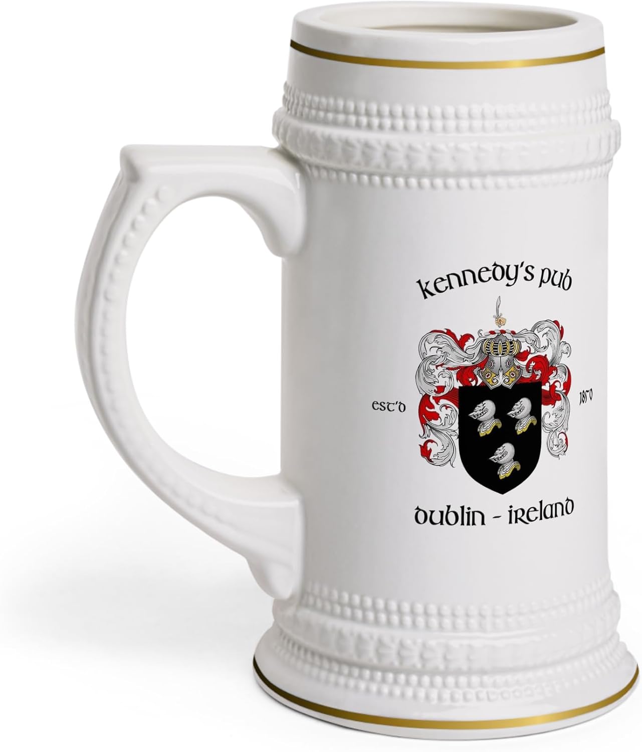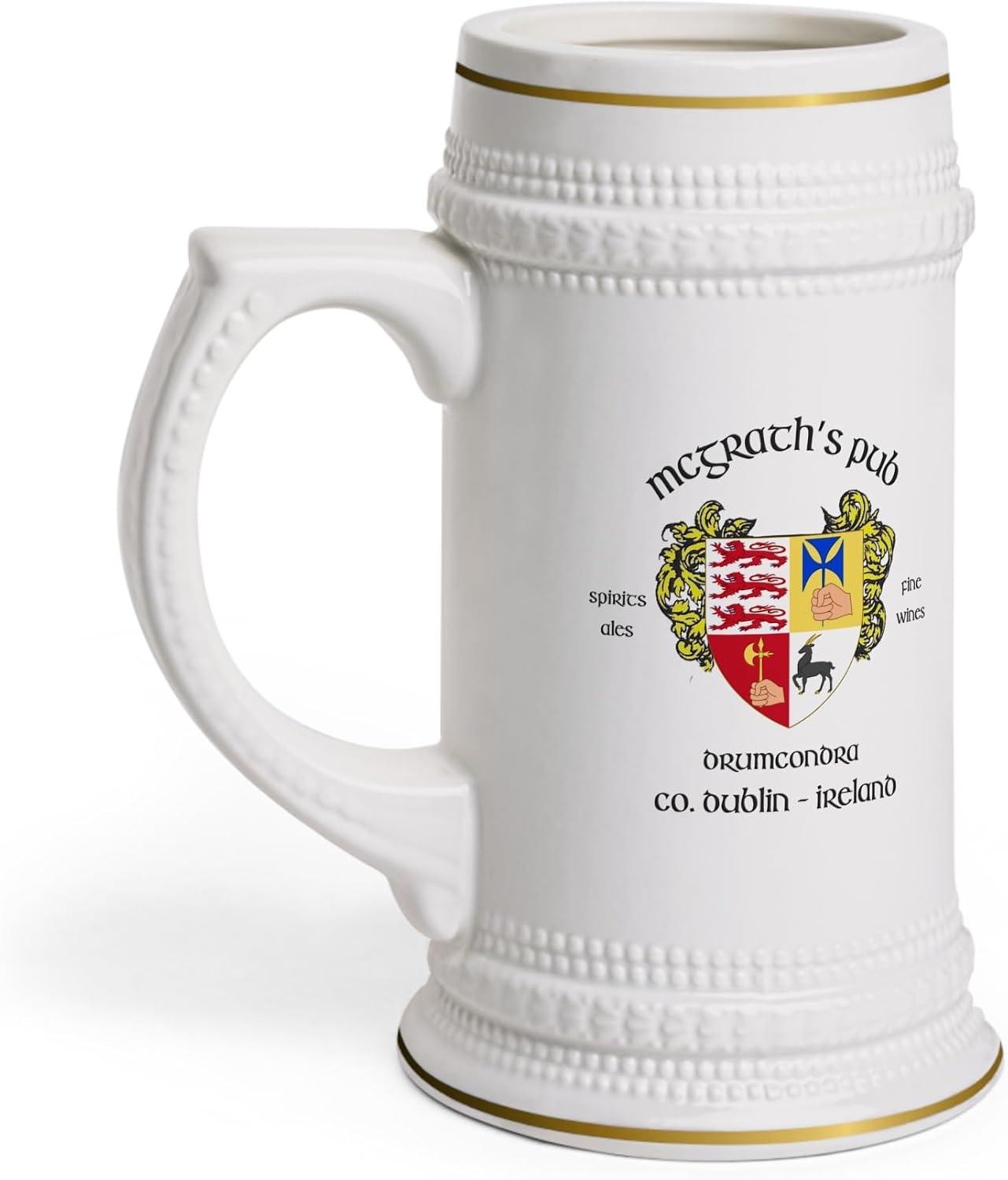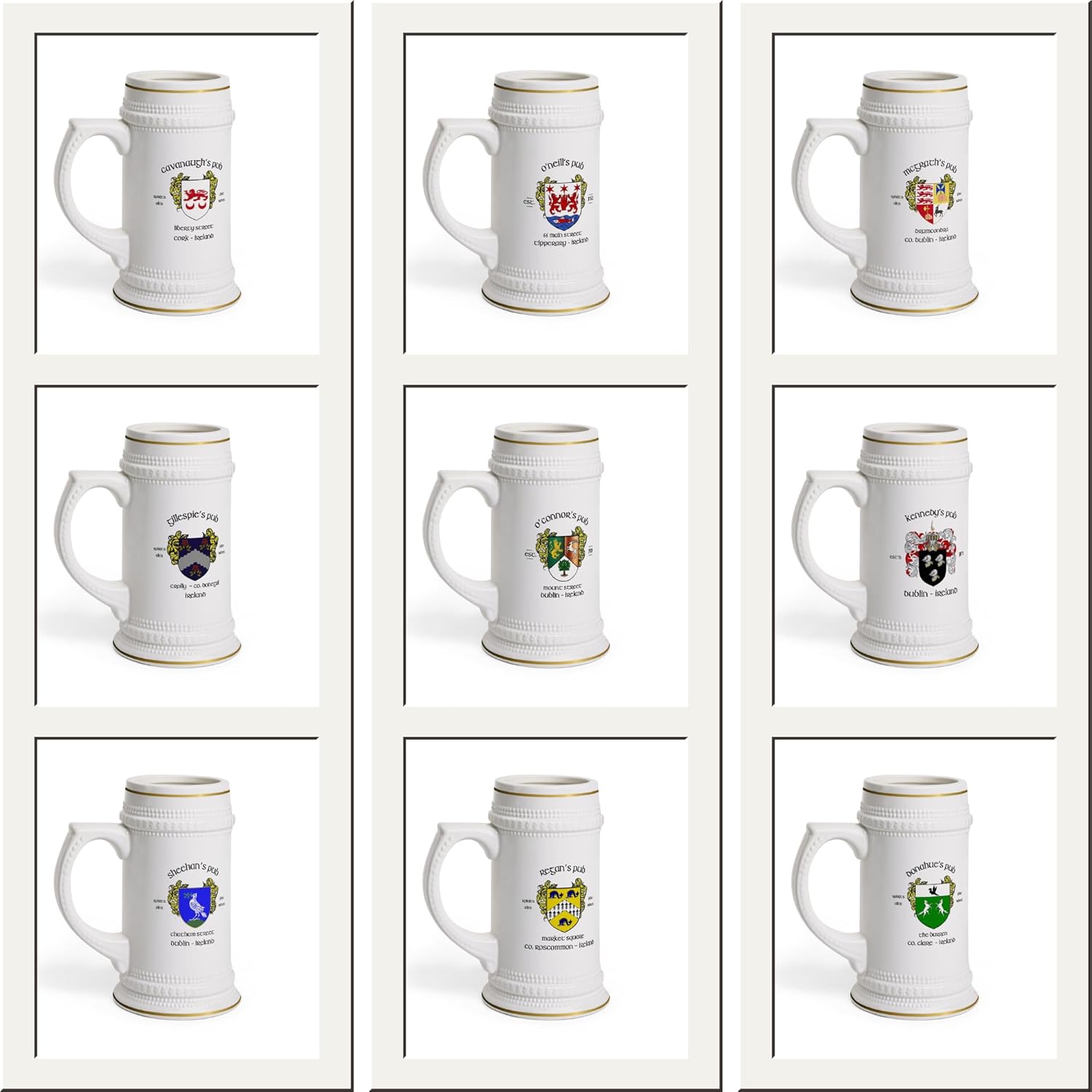 Raise a toast to Ireland’s rich pub culture with our authentic Irish pub ceramic beer steins, featuring designs from over 100 of Ireland’s most renowned and beloved Irish pubs and Irish bars. From ancient establishments to family-owned favorites, each stein captures the unique spirit and history of these iconic gathering places. Some feature the Irish family crest or Irish coat of arms, adding a special touch of Irish heritage. Whether you're reminiscing about a night in Dublin or dreaming of visiting the Emerald Isle, these steins bring the heart of Ireland into your home. Crafted with care, our ceramic beer steins are both durable and stylish, perfect for enjoying your favorite beer or displaying proudly in your collection. Each stein showcases genuine Irish pub designs that celebrate the individuality and charm of Ireland’s historic pubs. With detailed artwork and vibrant colors, these steins are a testament to the warmth and character of Irish bar hospitality. Perfect for collectors, beer enthusiasts, or anyone with a love for Irish pub culture, these steins make a unique gift that tells the story of its own. Whether you’ve visited these legendary Irish pubs or dream of experiencing them, holding one of these steins connects you to the rich tradition and camaraderie of Ireland’s pub scene. Start your collection today and enjoy a taste of Ireland’s most cherished pubs with every sip.