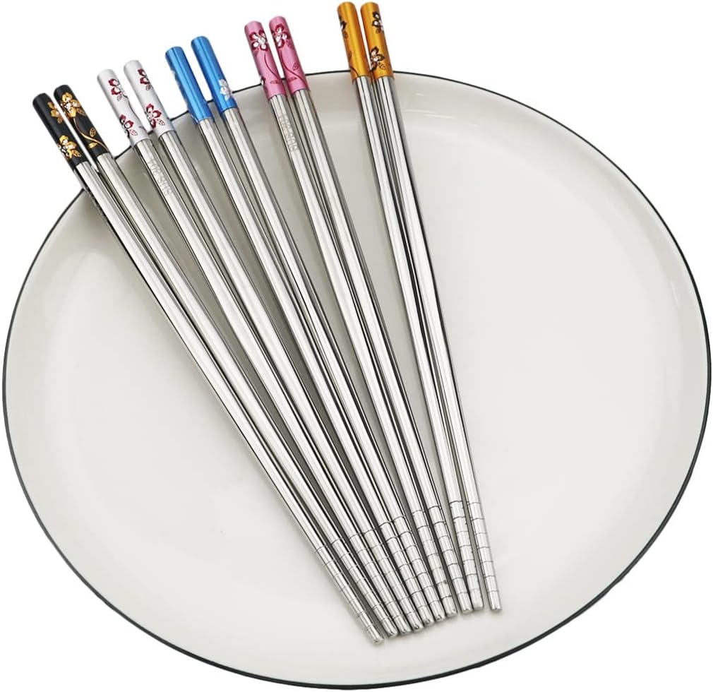 Material: 18/10 (304) stainless steel (food)Features: friendly, reusable, portable and easy to clean. friendly spraying process, safe and , without worrying about fading after long-term use.After each use, please wash the dishes with warm water and neutral detergent, avoid using chlorine or anti-limestone detergent.Hand washing: Do not use emery cloth or scrubbing cloth when washing by hand. Be sure to wash any food as soon as possible after use.Dishwasher: If you wash the dishes in the dishwasher, make sure that the dishes are completely dry after washing. Wipe dry with a soft cloth. Remove the cutlery from the cutlery and wipe it with a dry soft cloth, even if it looks dry.1. Please know that pair is set to serve user.2. Size information:Length: 23cmThickness: 0.9cmNotes:1. Please allow 1-3cm measuring deviation due to manual measurement.2. Due to the different monitor and light effect, the actual color of the item might be slightly different from the color showed on the pictures. Thank you!5 Pair X Printing ChopsticksThese chopsticks are ideal for any Asian dishes like eating sushi, rice, noodles at home, in caterers, restaurants, buffets, cafeterias, diners, cafes, etc