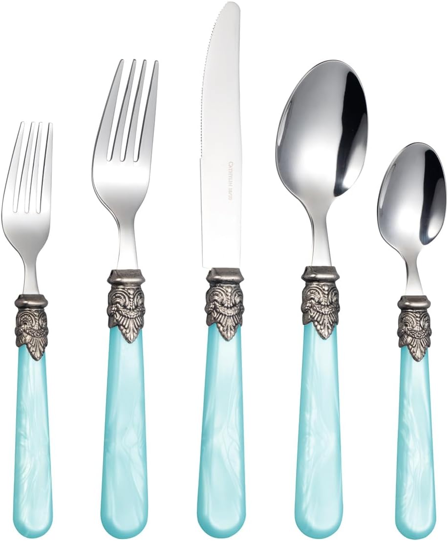Our Silverware set has been well-designed to be both durable and elegant. It's made of 18/10 stainless steel with white shiny pearl handle.
