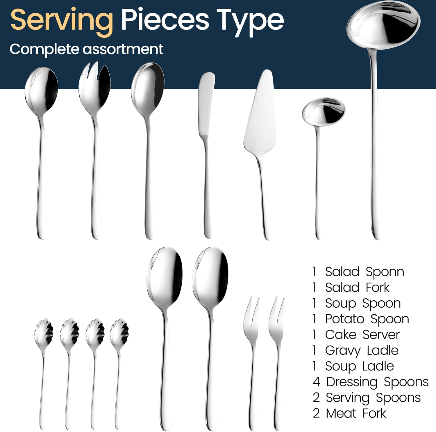 | Included Components | Table spoons 12pcs, Table forks 12pcs, Table knives 12pcs, Cake forks 12pcs, Tea spoons 12pcs, Sauce/dressing spoons 4pcs, Serving spoons 2pcs, Salad serving 2pcs, Meat fork 2pcs, Cake server 1pcs, Butter knife 1pcs, Gravy ladle 1pcs, Soup ladle 1pcs, potato spoon 1pcs |