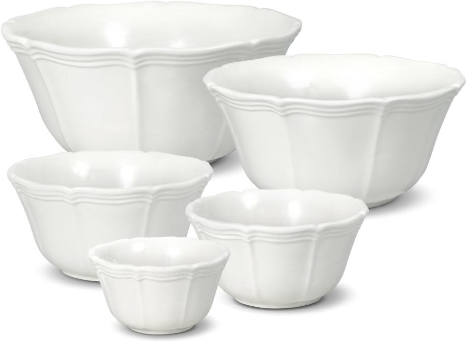 Mikasa French Countryside 65-Piece 18/10 Stainless Steel Flatware Serving Utensil Set, Service for 12Elevate the visual appeal of your formal table setting with this Mikasa French Countryside 65-Piece Cutlery Set by Mikasa. Beautifully crafted from premium 18/10 stainless steel to deliver outstanding beauty and performance, this elegant set features narrow necks accented by horizontal bands and classic teardrop handles with a vertical line design running down the center, creating distinct, eye-catching curves that add depth and movement to your place setting. 65-piece set, service for 12, includes: 12 each of dinner fork, salad fork, dinner knife, dinner spoon, and teaspoon, plus 1 serving tablespoon, 1 pierced tablespoon, 1 cold meat fork, 1 butter knife, and 1 sugar spoon. Dishwasher safe.Mikasa French Countryside Stackable Bowls, Set of 5Gently scalloped edges and curves on these generous sized pieces add grace every time you set the table. Its rich cream color makes French Countryside a perfect base pattern to mix with colorful accent pieces. A best selling pattern, a complete suite of accessories is available to create a classically stylish casual dining statement. Expertly crafted from earthenware. Microwave and dishwasher safe. This set of 5 stacking bowls come in a variety of sizes for a variety of tasks. From mixing up a batch of chocolate-nut cookies to serving holiday vegetables and even storing leftover chestnut stuffing. Set of 5 stacking bowls includes (1) each: 4 inch diameter (8 ounce), 5 inch diameter (14 ounce), 6 inch diameter (26 ounce), 7-1/2 inch diameter (40 ounce) and 8-1/2 inch diameter (60 ounce) bowls.