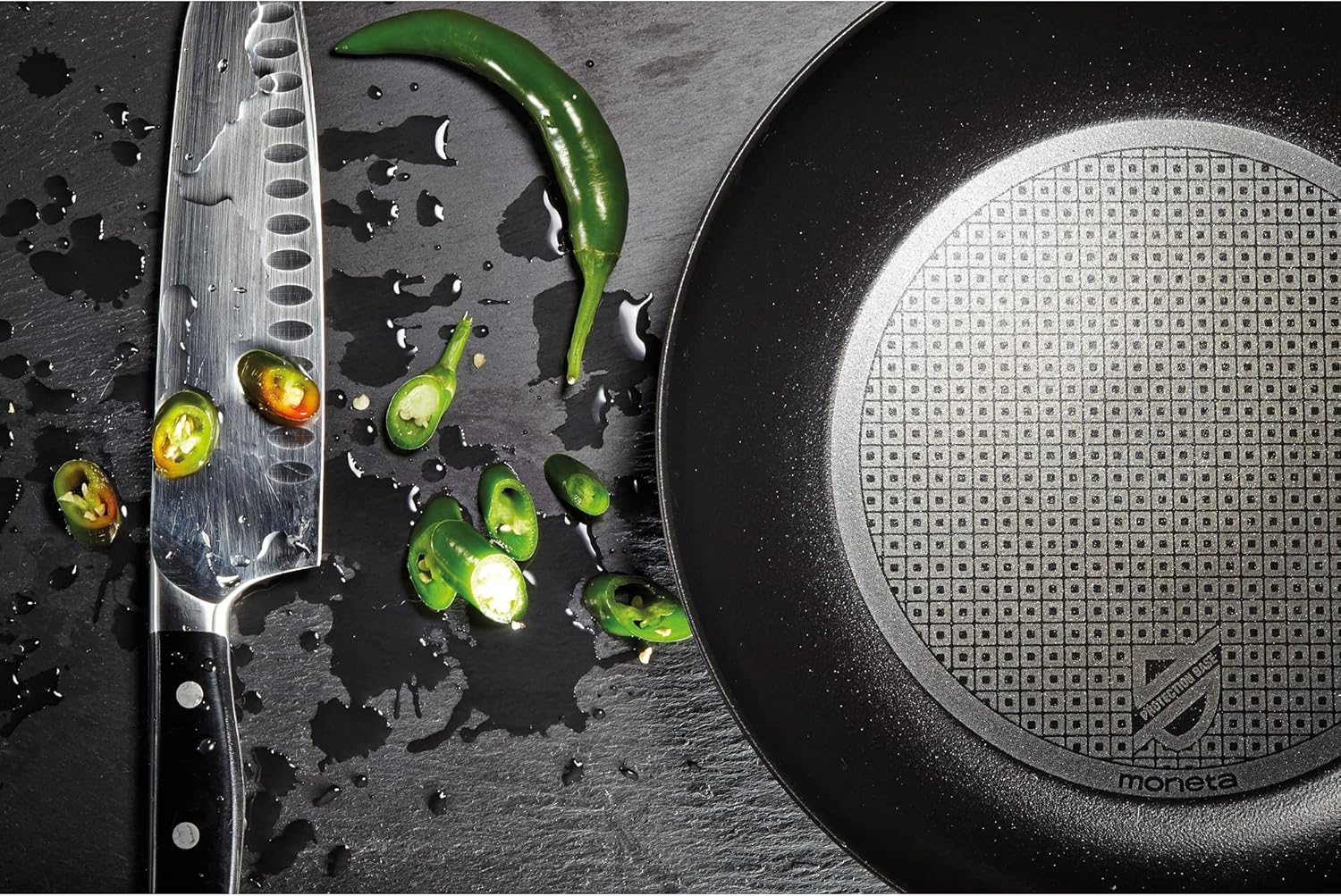 Moneta Nova with protection base coating, the maximum resistance and non-stick properties, as tested by SGS. The twin block system, with two screws, provides stability and durability: the handle is never losing. Suitable for all types of hob, including induction, thanks to the stainless steel bottom, which ensures optimum performance, without increasing the weight of the entire product.