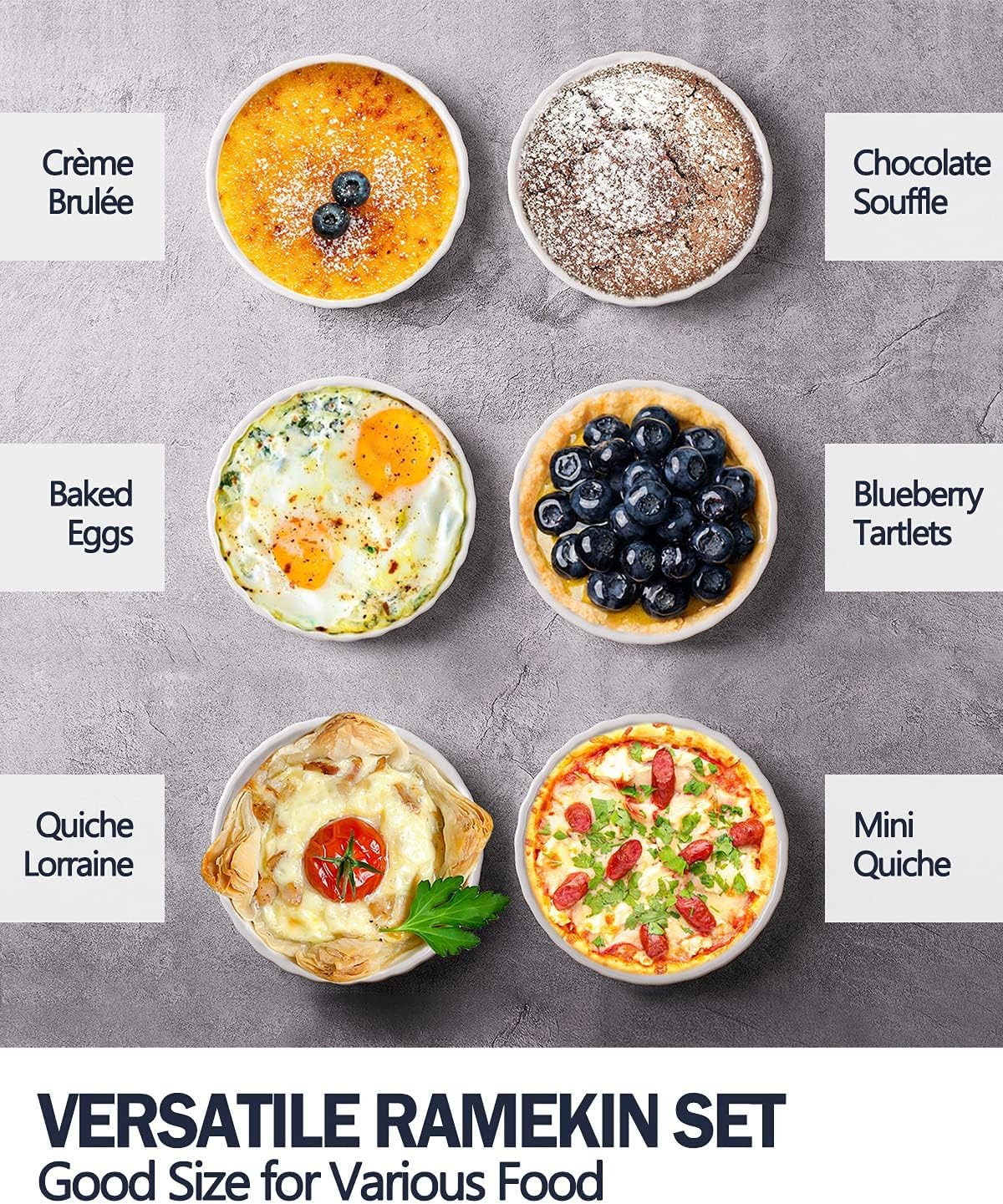 VERSATILE RAMEKIN SET - Porcelain creme brulee dishes with 5.1" diameter and 1.1" height. 8 Ounce capacity perfect for individual crème brulée, soufflés, custards, puddings, blueberry crumble, baking eggs, Also great side dipping bowls for nuts, bruschetta prepping ingredients. 12 PACK SOY SAUCE DISH SET - Ceramic dip bowls measure 3 x 3 x 1.5 inches. 3 Ounce capacity perfect for serving dips, sauce, condiments, appetizers, small snack, ice cream, dessert, nuts, fruits, candies, side dishes like olives etc.