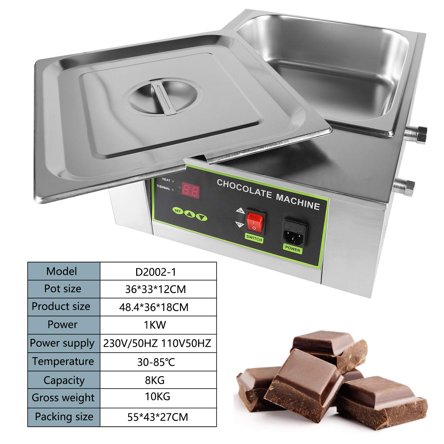 // Please note: The heating method of this melting furnace is water isolation heating. It is necessary to add proper water in the water tank so that the machine can start heating. Strictly prohibit dry burning. Product Description Digital display panel, temperature can be adjusted Equipped with drain valve and steam outlet valve M type heating tube, heating more quickly and evenly. The highest and lowest water level, eliminate dry burning. Technical Parameter Pot size:36*33*12cm(14.17*13*4.72”) Product size;48.5*36*18cm(19.1*14.17*7.09”) Power:1KW Vlotage:110V/220V Temperature( adjustable): 0~80℃(32℉~176℉) Capacity:8KG (17.64lbs) Gross weight:10KG Attention: One year warranty