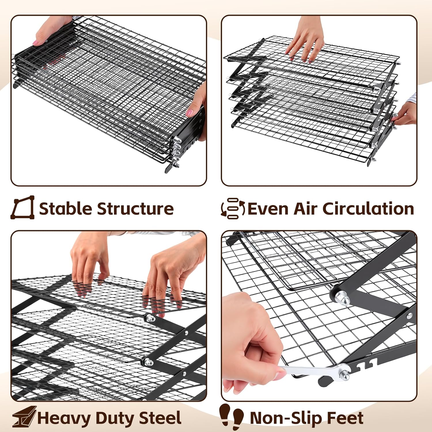 Timeet – Designed to Make Baking Easier, Faster, and More Efficient.Upgrade your baking setup with the Timeet 5-Tier Upgraded Collapsible Cooling Rack, designed for home bakers, cooking enthusiasts, and busy kitchens that need more space and efficiency.Unlike most cooling racks that offer only four layers, the Timeet rack features a spacious 5-tier design, allowing you to cool or dry more food at once. Whether you're baking multiple trays of cookies, cooling fresh bread, or preparing pastries for a gathering, the extra layer gives you the capacity you need without taking up additional counter space.The rack also features a smart 3-setting adjustable design, letting you change the spacing between tiers to fit different foods. From thin cookies and crackers to thicker cakes and pastries, you can easily adapt the rack to suit your baking needs.When the baking is done, the rack collapses flat for easy storage, making it perfect for kitchens where space matters. Simply fold it down and store it away until the next batch of baking.Built with durable metal construction, the rack offers excellent stability and airflow. The open wire design allows heat to escape quickly, helping baked goods cool evenly while maintaining their perfect texture.Beyond baking, this versatile rack can also be used for roasting, grilling, drying foods, draining fried items, or organizing kitchen prep. Whether you're cooling cookies, drying herbs, or preparing large meals, the Timeet cooling rack is a practical addition to any kitchen.