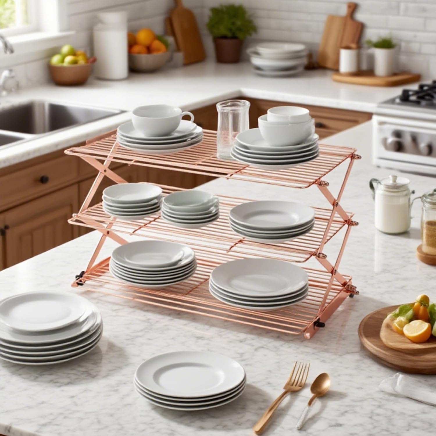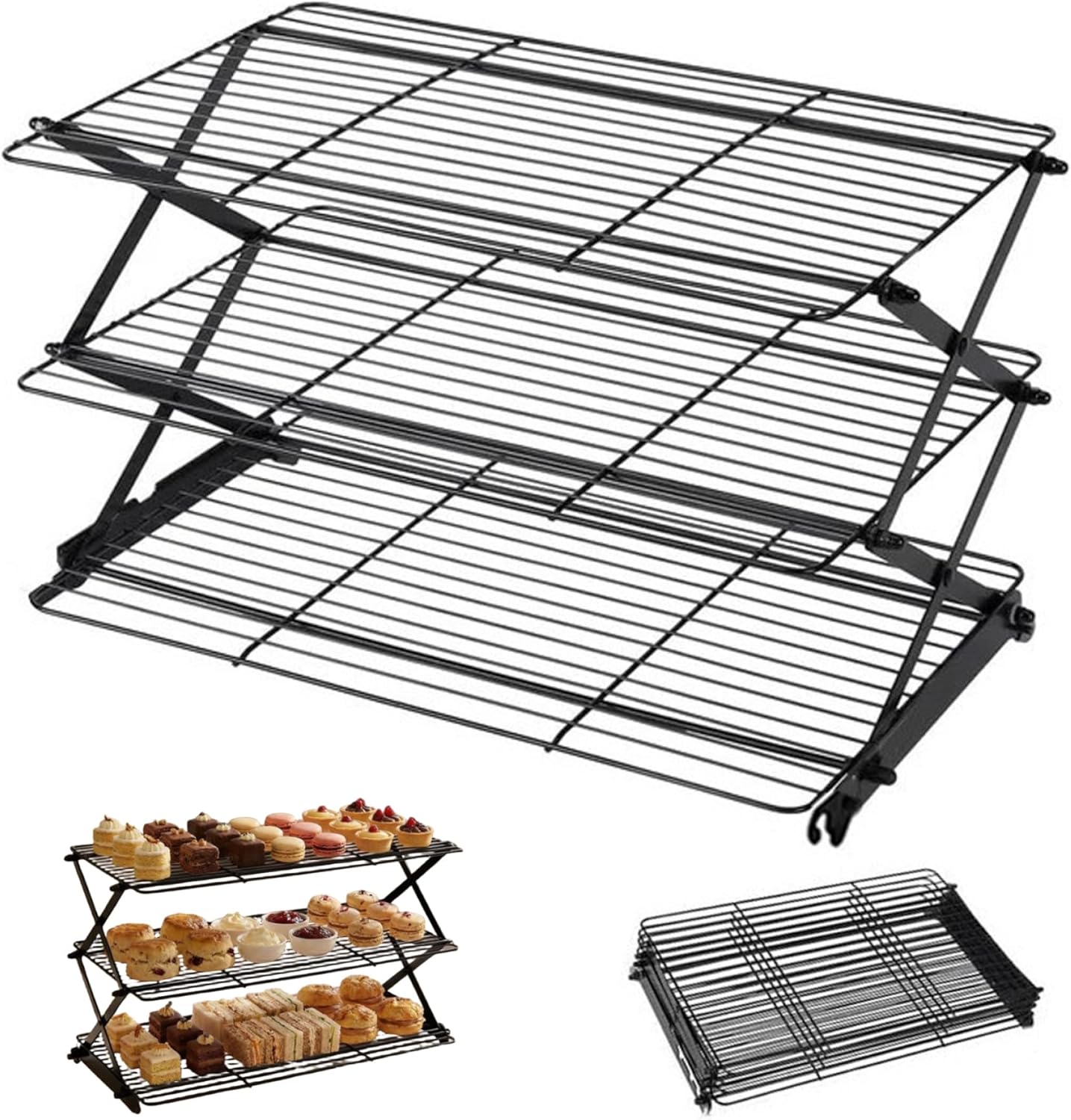 Description: This collapsible 3-tier wire cooling rack provides bakers and home cooks a heavy-duty, non-stick solution crafted from iron for maximum durability and stability. Measuring 40x26x6 cm (15.8x10.2x2.4 inches), its multi-tier design efficiently increases cooling capacity, making it ideal for cooling multiple batches of cookies, cakes, pizzas, and grilled foods simultaneously. The non-stick surface ensures food doesn't cling, improving release and simplifying cleaning to save time after baking. Its collapsible feature allows the rack to fold flat for compact storage, perfect for kitchens with limited space without compromising on robust construction or functionality. This versatile cooling rack is specifically designed to enhance air circulation, helping baked goods cool quickly and evenly, which is critical for preserving texture and flavor. Perfect for baking enthusiasts and professional bakers alike, it combines practicality with stable design, meeting the needs of both cooking and baking applications. Features:. -Color: Rose Gold. -Material: Iron. -Size: 40x26x6 cm/15.8x10.2x2.4 inch. Note:Manual measurement, please allow slight errors on size.The colors may exist slight difference due to different screens. Package Including 1 * Cooling Racks