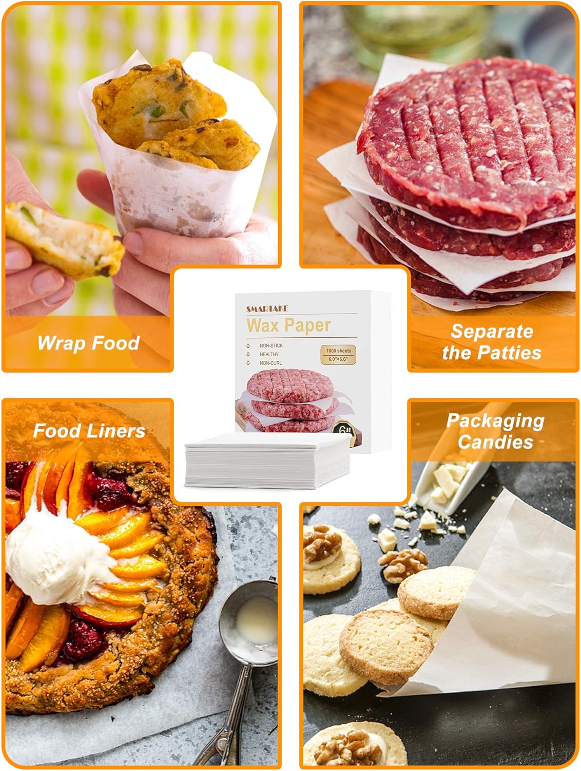 SMARTAKE is committed to providing high-quality products and excellent services to bring convenience to your life.What's in the package?There are 1000pcs 6 X 6 inches deli paper sheets of high-quality disposable food-grade wrapping tissue.Are these wax paper whether is microwavable and oven safe?Yes, it could put into the microwavable and oven safe.Will the meat stick to the paper?Absolutely Not! This non-stick hamburger patty paper wax is coated with wax on both sides, which will not make the food stick to the wax paper.Anything else?A good service. If you are dissatisfied with the quality of our wrap wax paper sheets or have any questions, please contact us, we would reply to you within 24 hours.