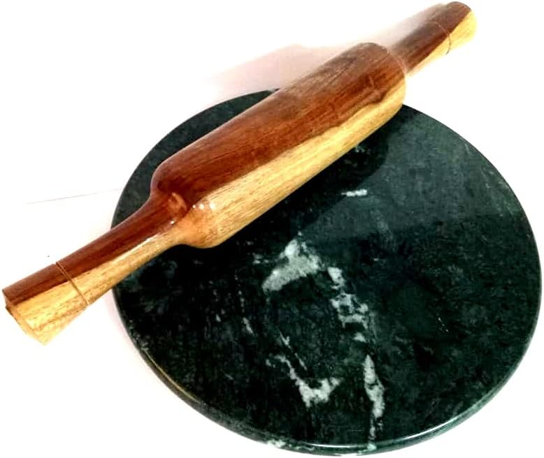 Green granite Roti Roller/Wodden Chakla Belan/Rolling Pin Board/Roti Maker/Phulka Maker/Chapati Maker Wooden chakla for Home & Kitchen Chakla diameter is 9 Inches Chakla hight is 0.5 Inches belan diameter is 2 Inches belan lenght is 10 Inches Made Manually by Experience Handicraft artisan Easy to maintain/ clean, dishwasher safe and won't absorb food odours or stains Design varies as made up of natural stone..