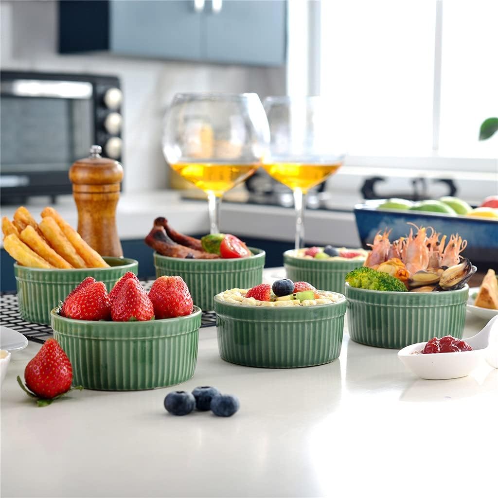 Specification: Size: 10 x 4.7 CM Capacity: 200ML Color:Green Material: Stoneware Features: HARMLES FOR BAKING:Size: 10x10x4.7cm; Capacity: 290 ml. oven dishes are made of durable porcelain with lead-free and non-toxics. Chip-resistant and more sturdy than stoneware. Hybrid ceramic nonstick are PFOA- and PTFE-free, provides exceptional food release. It resists chipping and flaking, easy clean up after baking. Perfect for creme brulee, jams, poaching eggs, french onion soup, panna cotta, cream, and lava cake. STACKABLE & EASY TO CLEAN: Ramekins with card slot design makes the stack more stable and comfortable. Just simply pile them up and they won't take much space in your cabinet, which keeps your kitchen organised and your surfaces clean and free of cross-contamination. Ramekins feature durable, glazed porcelain construction. Interior and exterior glaze protect ramekins against stains, making it easy to clean. MICROWAVE & DISHWASHER SAFE:Fired in high temperature, makes our oven dish much harder and resistant to crack. Perfectly compatible with cold & hot food without worry about chips, nicks, cracks, and scratches. Easy to clean ,Goes Safe in the microwave, freezer, refrigerator, dishwasher. Oven safe on 450 ℉. MULTI-USE & EXQUISITE GIFT:The versatile and stackable ramekin sets serve for cheese or egg dishes, souffles, baked cocotte, baked mac and cheese, quiche or creme brulee, and any crisp, cobbler or crumble dessert. It