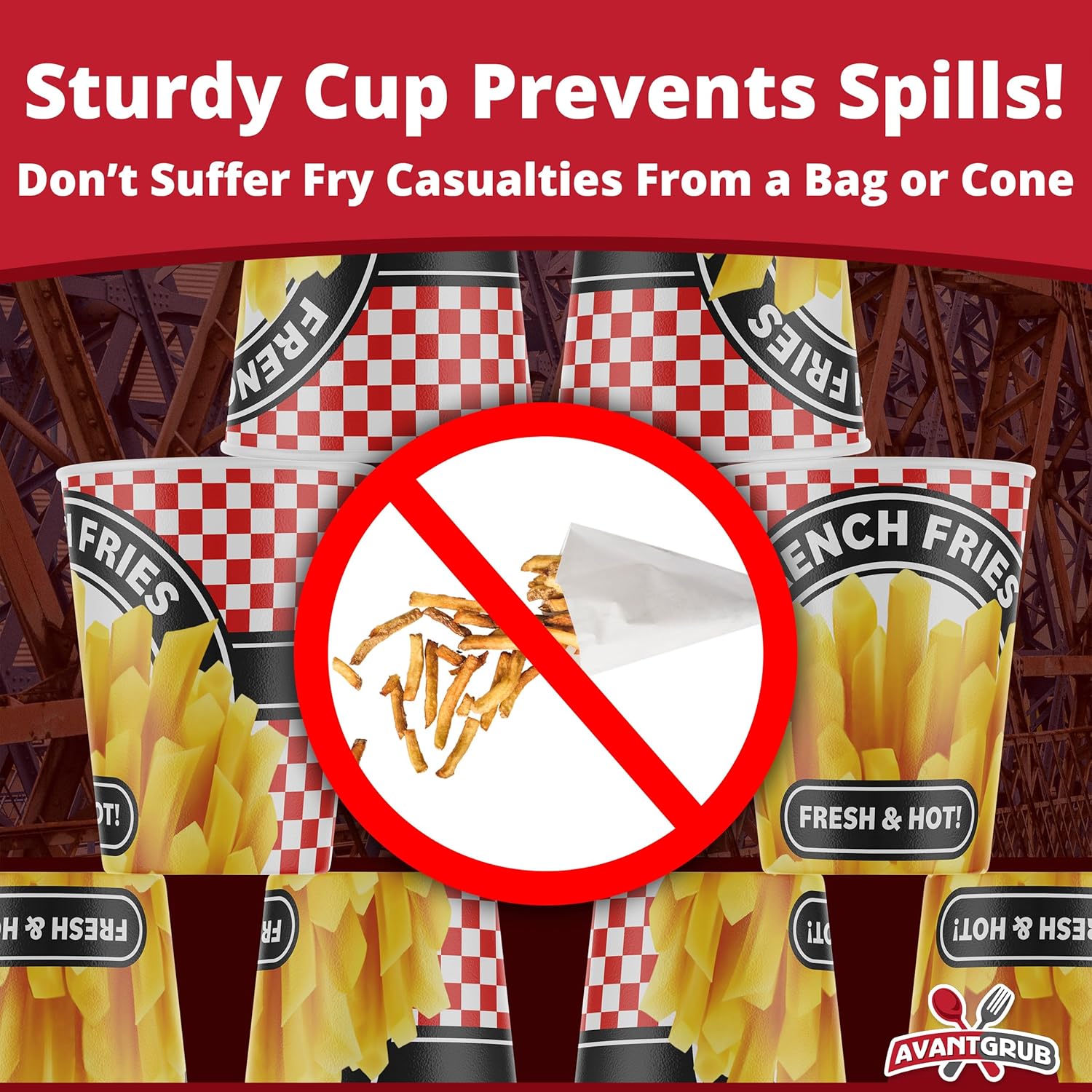 Sturdy, Spill Resistant Festive French Fry Cups Are Best for Your Guests’ Convenience!Help your guests avoid leakage, food spillage and the cumbersome carrying of paper bags or fry cones. Our cardboard food cups can be set down without spilling so your guests can pause their snacking for a moment to play a carnival game, stand up to cheer for their team or take care of another task that requires both hands! No need to suffer fry casualties falling out after setting down a flimsy fry container! A fry saved from falling is an extra fry eaten!Add a Fun, Retro Vibe With The Festive Checkered Design!Sure, you could just get plain cups for your event, but what fun is that? Aren't you bored of the white and brown? Add some festivity to your festival or some fun to your fundraiser with a classic paper fry cup design! The flat bottom is ideal for displaying and presentation.How Many Fries Does This Appetizer Serving Cup Hold?That depends on the size of the fries you're serving, but for size reference, the fry serving cups are about the size of a regular 12 oz soda can.What other items can I use your cups for?Don't limit yourself to french fries! Our disposable, grease resistant snack holders will hold crackers, bread sticks, cheese, fruit, veggies, chicken nuggets, skewers, meat, greasy foods, snacks, popcorn, chips, poppers, onion rings and charcuterie.What’s in the box?We'll send you 250 fry cups in a sealed bag to ensure cleanliness for your guests. Each cardboard fry container holds 12 fluid ounces of product and is grease-resistant and ketchup-safe to avoid spillage and embarassing moments!Satisfaction Assured for Life!If you aren’t completely satisfied with your order, simply email us, and we will respond within 24 hours to make it right even on the weekends. We absolutely assure your satisfaction!