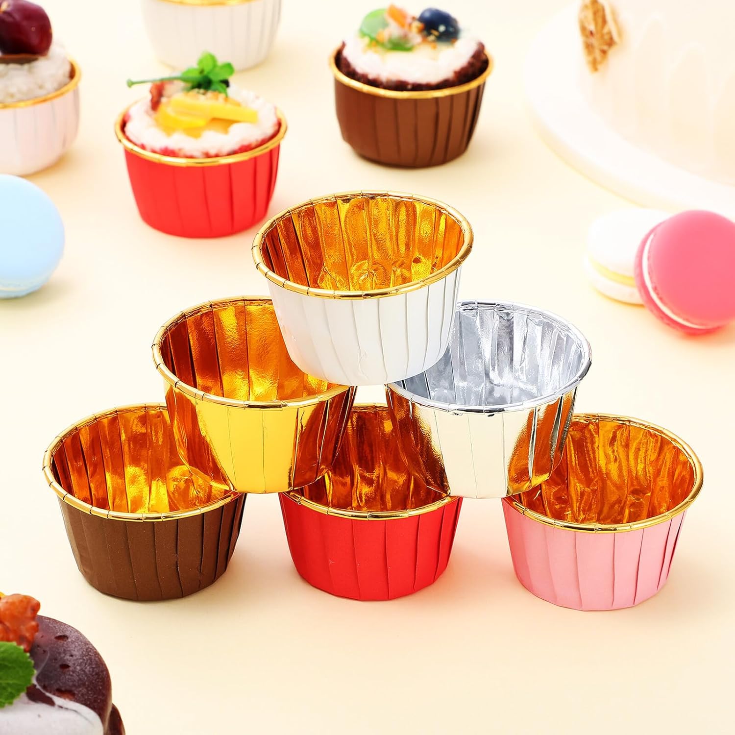Package List 300 x Cupcake Liners (6 Styles) Features - Easy to use and operate: Suitable for professional bakery and personal at home. Each cupcake cup comes with a curly-rimmed opening for easy unmolding and consumption Creative Cupcake Liners - Bright colors design: The cupcake liners can well decorate your cupcakes and muffins, make them look more delicious. - : The cups are high-temperature resistant, no fading nor sticking, , for desserts. - Wide range of use occasions: The good choice for your birthday, wedding, shower, Christmas holiday, and other banquets Grease Proof Muffin Cups. -Material:Composite paper - Practical to use: Oil proof and waterproof, easy to release. High temperature resistance of 220 degrees, can be baked in the oven. Perfect for places like home kitchen, cafe, bakeries, dessert stores to use small muffin liners. -Product Info:Laced membrane roll cup -Size:3.80X7.00X3.80cm/1.49X2.75X1.49in -Color:Assorted ColorGoods Descriptiondecorative baking cups Disposable muffin cups for various occasions.Cupcake Holder With our cupcake liners, you can bake cupcakes or muffins at home or in the bakeries.paper cupcake liners for baking They are at high temperatures, can be used with confidence, non-sticky.baking cups muffin Suitable for use in bakeries, cafe and other places