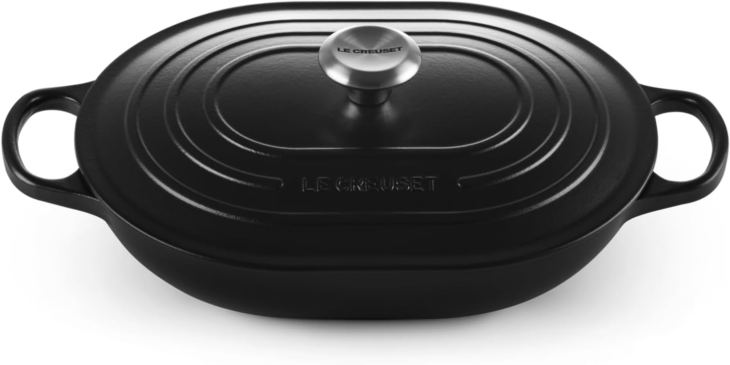 Perfect for sautéing, shallow frying, steaming and serving dishes straight to the table, the enameled cast iron Signature Oval Casserole can handle everything from roasts and whole fish to vegetables and side dishes. The elongated oval shape is ideal for larger cuts of meat, hearty stews and baked casseroles meant to share. The sloped sides and wide cooking surface make stirring and serving a breeze. Use it with the lid as a traditional casserole for family meals, or without as a roaster or buffet dish when entertaining guests.