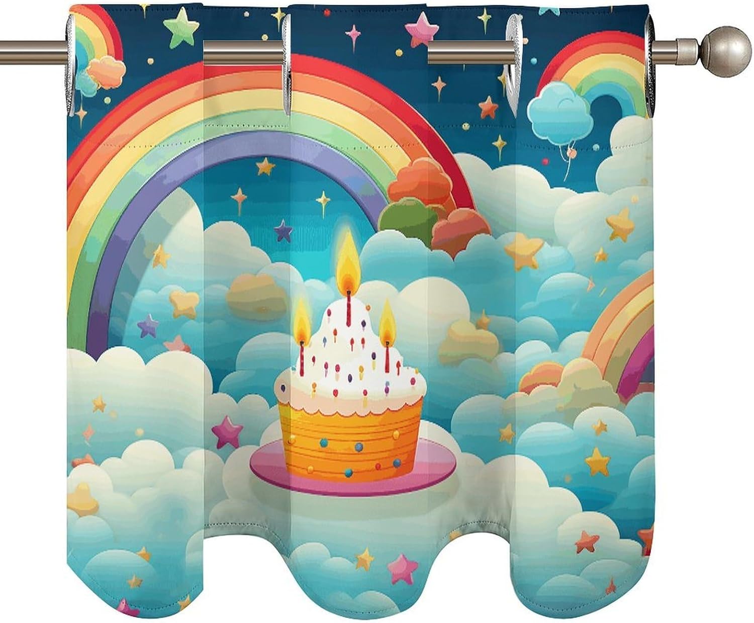 Perfect Pair Printed Curtain - Rainbow Birthday Light Filtering Modern Window Décor Elevate your windows with our beautifully designed two-piece Rainbow Birthday curtain set, combining a functional printed curtain with an elegant coordinating valance. Crafted for versatility, this Rainbow BirthdayCurtain is the ideal solution for adding privacy, style, and controlled light to any room. Premium Fabric & Modern Design: Crafted from premium fabric, this Rainbow Birthday Curtain maintains a soft hand-feel and a graceful drape over time. The elegant print and smooth texture provide a sophisticated look that enhances your home's ambiance. Optimal Light Filtering & Protection: This Rainbow Birthday modern curtain effectively filters harsh sunlight, creating a softly illuminated and comfortable atmosphere. It helps protect your furniture and flooring from UV damage while providing a good level of privacy. The fabric is resilient and designed for easy care. Versatile Application: This Rainbow Birthday ready-to-hang Curtain is designed for broad compatibility. The curtain features standard 4.5cm grommets for smooth gliding on most curtain rods. With dimensions of 52" W x 18.1" H per panel, it's perfectly suited for various window styles. Ideal as a charming kitchen curtain or cafe curtain for bottom-up coverage, it also functions perfectly as a tier curtain. Whether you're looking for a stylish printed curtain for your living space, a functional light filtering curtain for a bedroom, or a complete look with a curtain valance, this Rainbow Birthday set delivers both style and purpose. Set Includes: Two printed curtain panels Bring a cohesive and stylish upgrade to your home with this Rainbow Birthday versatile curtain .