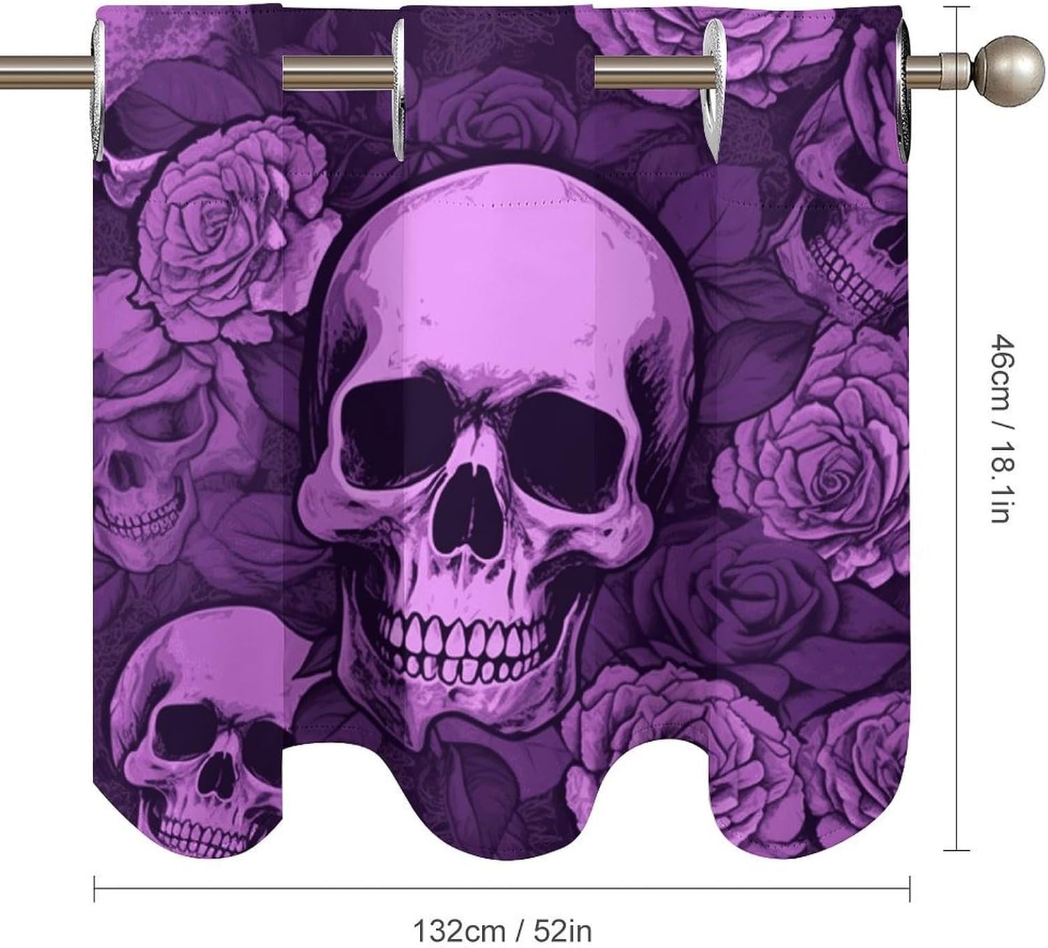 Perfect Pair Printed Curtain - Purple Skulls And Roses Light Filtering Modern Window Décor Elevate your windows with our beautifully designed two-piece Purple Skulls And Roses curtain set, combining a functional printed curtain with an elegant coordinating valance. Crafted for versatility, this Purple Skulls And RosesCurtain is the ideal solution for adding privacy, style, and controlled light to any room. Premium Fabric & Modern Design: Crafted from premium fabric, this Purple Skulls And Roses Curtain maintains a soft hand-feel and a graceful drape over time. The elegant print and smooth texture provide a sophisticated look that enhances your home's ambiance. Optimal Light Filtering & Protection: This Purple Skulls And Roses modern curtain effectively filters harsh sunlight, creating a softly illuminated and comfortable atmosphere. It helps protect your furniture and flooring from UV damage while providing a good level of privacy. The fabric is resilient and designed for easy care. Versatile Application: This Purple Skulls And Roses ready-to-hang Curtain is designed for broad compatibility. The curtain features standard 4.5cm grommets for smooth gliding on most curtain rods. With dimensions of 52" W x 18.1" H per panel, it's perfectly suited for various window styles. Ideal as a charming kitchen curtain or cafe curtain for bottom-up coverage, it also functions perfectly as a tier curtain. Whether you're looking for a stylish printed curtain for your living space, a functional light filtering curtain for a bedroom, or a complete look with a curtain valance, this Purple Skulls And Roses set delivers both style and purpose. Set Includes: Two printed curtain panels Bring a cohesive and stylish upgrade to your home with this Purple Skulls And Roses versatile curtain .