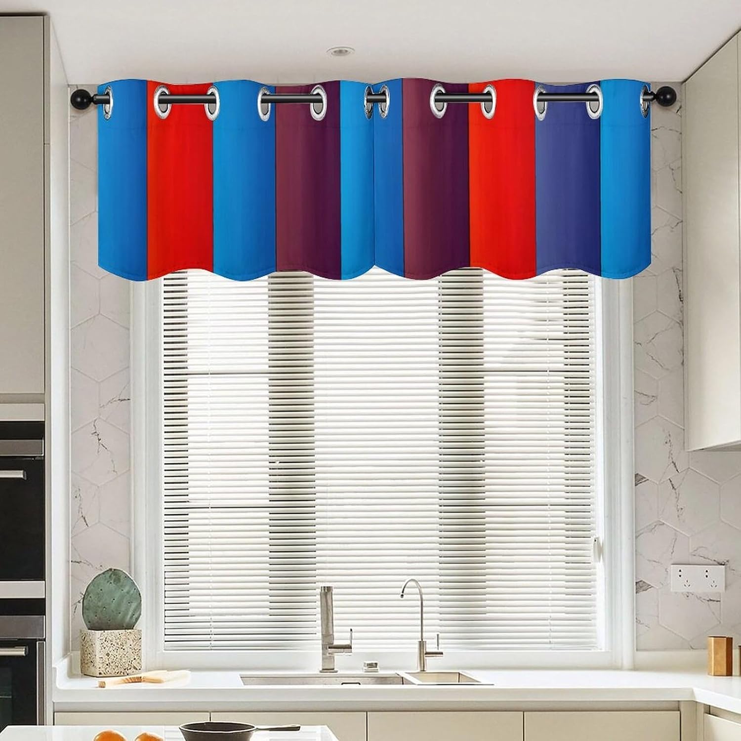 Introducing our 2-piece Red Blue Vertical Curtain Valance, a wonderful blend of functionality and elegance to elevate your window decor. Measuring 52 x 18.1 inches per piece, this Red Blue Vertical curtain set fits most windows, making it a versatile choice for any room. Crafted from premium curtain fabric, it combines soft touch with long-lasting durability, bringing comfort and practicality to your space. This Red Blue Vertical modern curtain features an elegant appearance and smooth texture, adding sophistication to your windows. As a light filtering curtain, it gently softens sunlight while providing moderate privacy, creating a warm glow—ideal for spaces wanting natural light without harsh glare. It also boasts impressive light-blocking performance, insulating your room from heat, protecting furniture and floors from UV damage, and creating a comfortable environment for better sleep. Designed for convenience, each Red Blue Vertical curtain has a 4.5cm curtain hole for easy installation on most rods. The washable fabric maintains its shape and softness after multiple washes, with nice drape to keep it neat. Whether you need a kitchen curtain, cafe curtain for a cozy nook, or tier curtain for layered decor, this Red Blue Vertical set fits well. Versatile and stylish, this Red Blue Vertical set works seamlessly as Valances or Curtain Valance, complementing various decor styles. It can also be used as a printed curtain to add a subtle decorative touch to your living room, bedroom, kitchen, or other spaces. Suitable for most windows, this Red Blue Vertical modern curtain is a practical that combines functionality with timeless style. Upgrade your window treatments with our 2-piece Red Blue Vertical Curtain Valance set—where quality, style, and functionality meet.