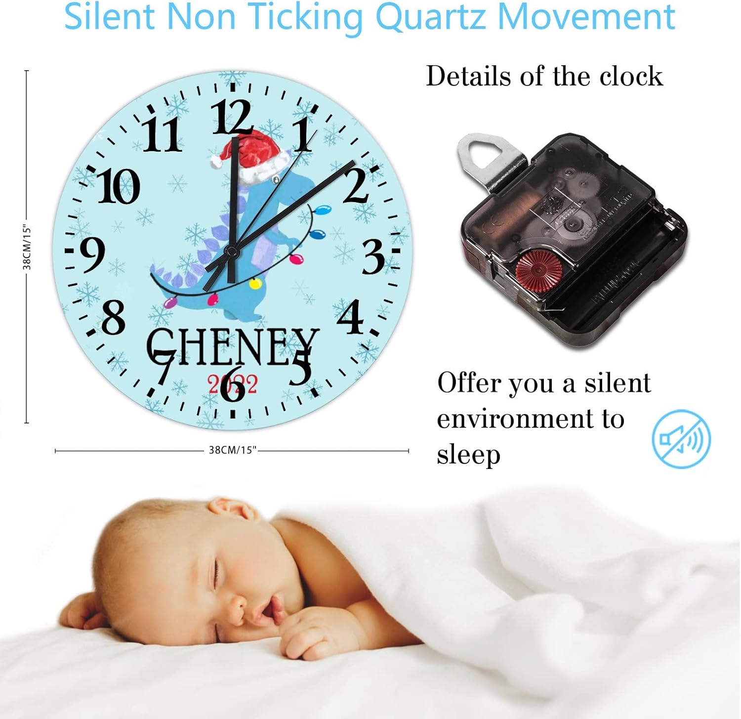 Dinosaur Xmas Boy And Girl Custom Gift Clock Gift for Baby Boy clocks for living room decor Battery Operated Quartz Analog Quiet Arabic Numbers Clock Home/Office/Kitchen Decor 15 Inch??Details:Product Size: 10/12/15 inches, (25/30/38 cm)Shape:RoundMaterial: Wood??Functional Home DécorThis Custom Boys Christmas Gift clock aren't just for timekeeping. They function as beautiful wall decor pieces, beyond telling time, and bring both style and purpose to any room.A charming home decoration, very suitable as a housewarming gift, making the home more warm. Suitable for any room, you can put it in any room such as home, living room, master bedroom, kitchen, bathroom, home office, etc. Elegant, durable and stylish.??Clock Hands Troubleshooting Guide:Check that the battery is a new battery and not a used battery.Make sure the hour and minute hands are not crossing or touching each other. If they are, adjust the hands by slightly bending them.See if the center pin that holds the hands together is firmly pushed in or screwed on, depending on the style.If hands are still not moving after the above, please reference the hands replacement instructions included with all of our open face clocks.