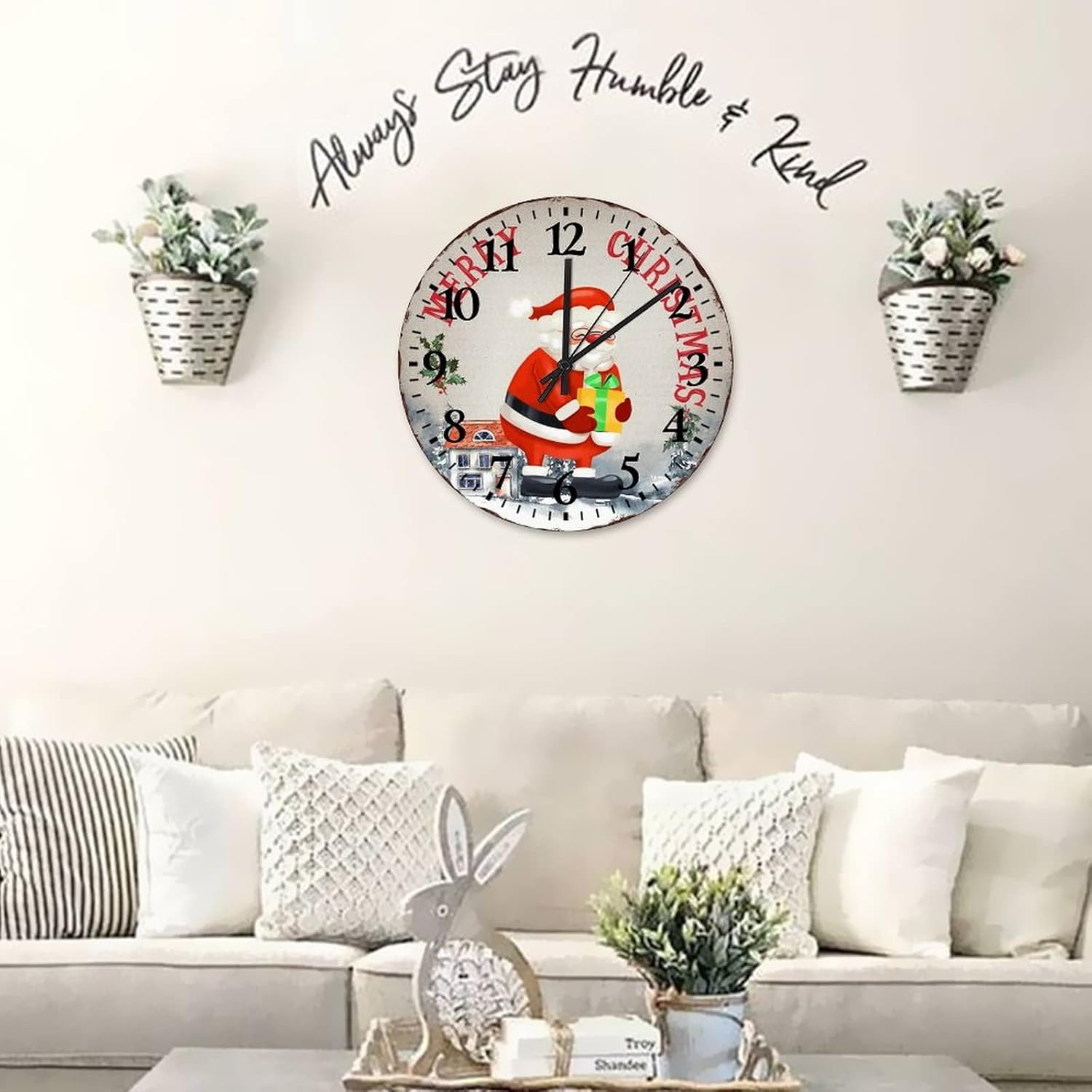 Merry Christmas Santa Claus Wood Clock Vintage Christmas Santa Claus Home Decor Wall Clocks Quartz Analog Quiet Arabic Numeral Clock Bathroom Kitchen Living Room Bedroom 15 Inch??Details:Product Size: 10/12/15 inches, (25/30/38 cm)Shape:RoundMaterial: Wood??Functional Home DécorThis Vintage Retro Xmas Santa Claus clock aren't just for timekeeping. They function as beautiful wall decor pieces, beyond telling time, and bring both style and purpose to any room.A charming home decoration, very suitable as a housewarming gift, making the home more warm. Suitable for any room, you can put it in any room such as home, living room, master bedroom, kitchen, bathroom, home office, etc. Elegant, durable and stylish.??Clock Hands Troubleshooting Guide:Check that the battery is a new battery and not a used battery.Make sure the hour and minute hands are not crossing or touching each other. If they are, adjust the hands by slightly bending them.See if the center pin that holds the hands together is firmly pushed in or screwed on, depending on the style.If hands are still not moving after the above, please reference the hands replacement instructions included with all of our open face clocks.