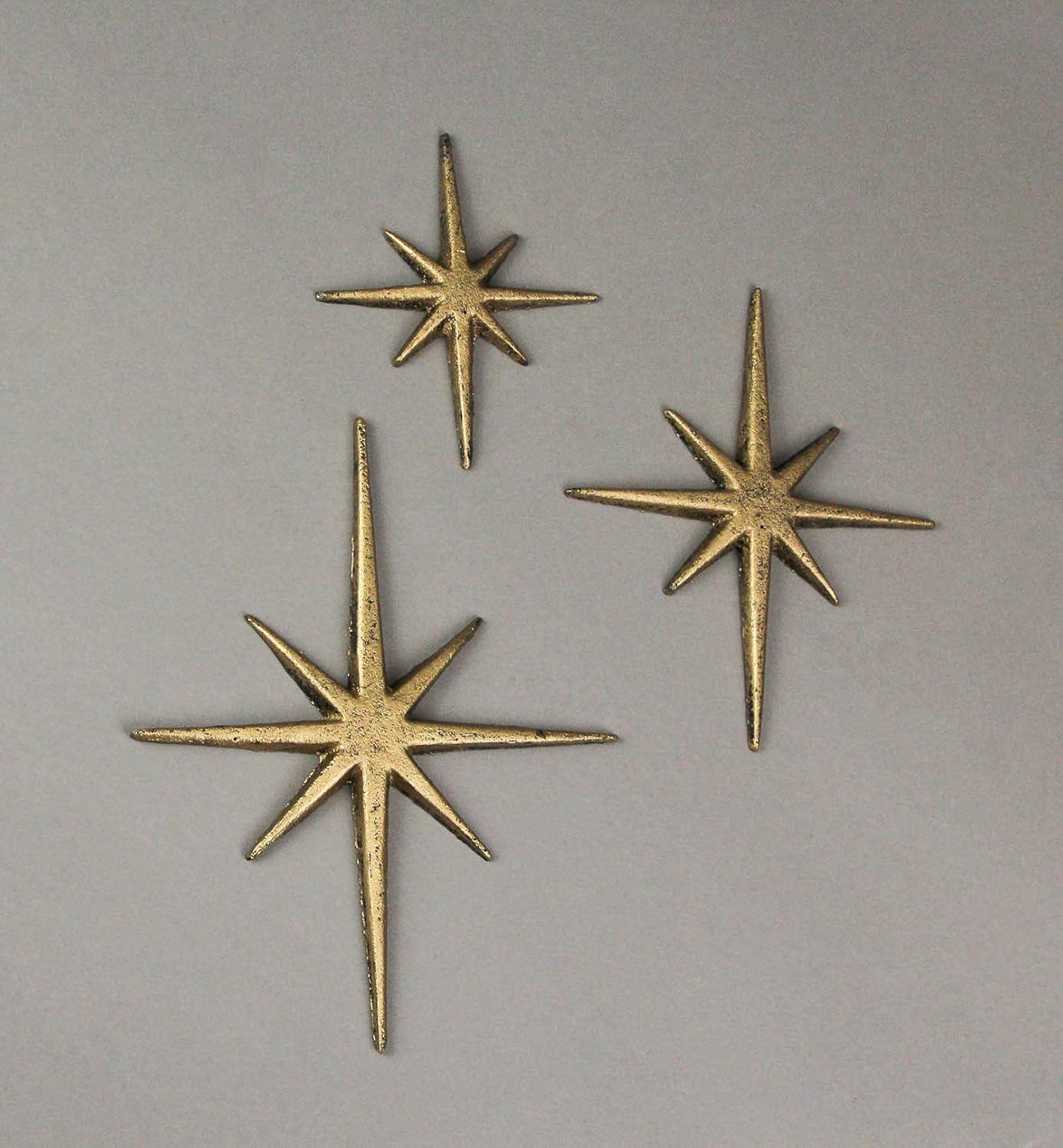 Add a touch of Mid-Century modern charm to your indoor or outdoor decor with this captivating trio of 8-pointed atomic starbursts. Crafted from durable cast iron, these stars boast an antiqued metallic gold enamel finish, lending them an appealing aged look. The large star measures 8.5 inches high, 6.75 inches wide, and 0.25 inches deep, while the medium star is 6.75 inches high, 5.25 inches wide, and 0.25 inches deep. The smallest star stands at 5 inches high, 4.25 inches wide, and 0.25 inches deep. Whether hung together or separately, these starbursts make a perfect accent for vintage, beach, or nautical-themed rooms. Their unique design adds a touch of retro allure, creating an eclectic atmosphere in any space. Whether adorning your living room, bedroom, or outdoor area, these stars serve as eye-catching focal points. The blend of Mid-Century modern aesthetics and timeless artistry makes them a versatile addition to your home decor, enhancing the visual appeal of any room with their distinctive presence. Embrace the allure of atomic-era design and elevate your space with this stylish and iconic metal sculpture.