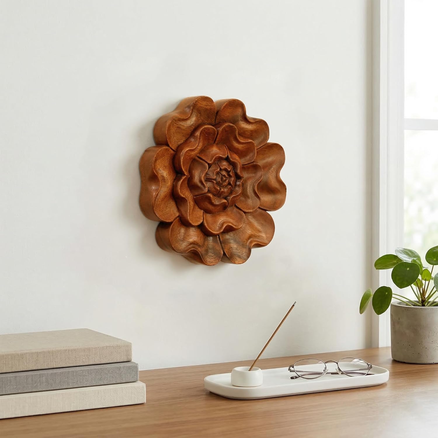 Take note from nature as you grow. The water lily is a sacred flower that allegorically epitomizes the ancient art of mindfulness and meditation. Carved from suar wood and shaped like a blooming lotus, this handmade wooden plaque takes decorative form to aesthetically promote a serene state of peace.