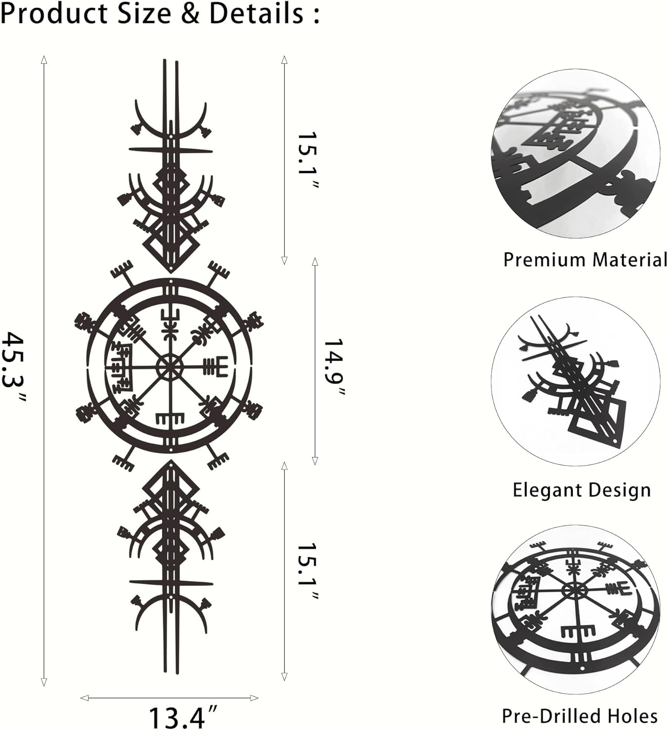 Unleash the captivating allure of Viking lore into your living spaces with our Viking Compass Wall Decor. Expertly tailored for admirers of Norse mythology and Viking culture, this wall sculpture transcends mere adornment, transforming your surroundings into a narrative-rich haven. Boasting meticulous craftsmanship and resilient materials, this piece stands as a testament to the enduring spirit of the Vikings. Its innovative modular design allows for easy assembly, as three interconnected parts unite harmoniously via screws, offering flexibility in presentation. The sleek black finish not only imbues the viking wall art with an air of sophistication but also acts as a protective shield against rust, ensuring longevity whether displayed indoors or exposed to the elements in outdoor settings. From the cozy corners of your living room to the vibrant atmosphere of your kitchen, or even as a striking addition to your bedroom, this Nordic decor seamlessly adapts to any environment. Moreover, this Viking compass makes for an extraordinary gift, bestowing upon the recipient a tangible connection to the mystical world of Norse legends. Embrace the power and mystique of ancient Nordic traditions with our Viking Compass Wall Decor, and let it serve as a captivating testament to your admiration for this timeless cultural legacy.