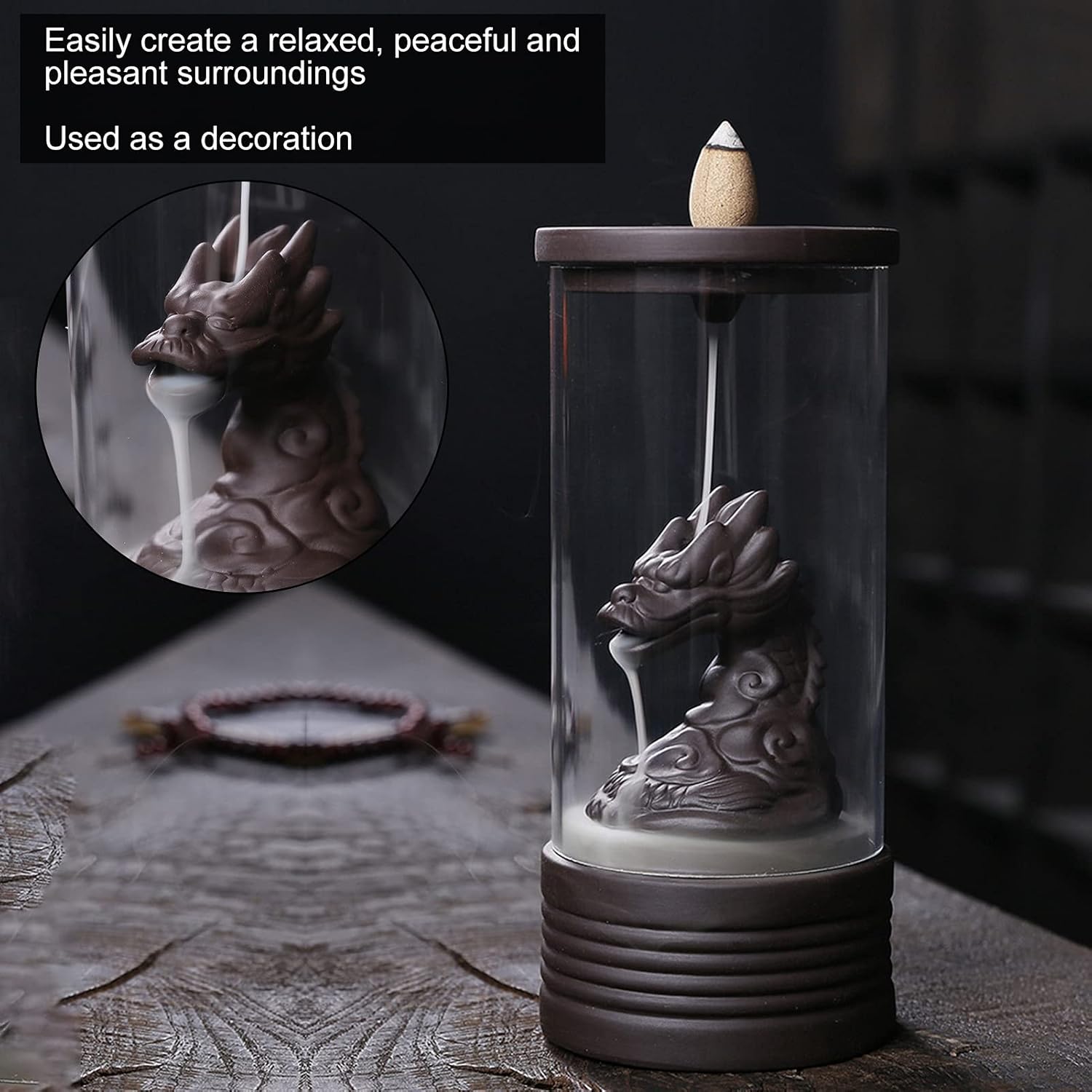 Feature: 1. This backflow incense is equipped with a windproof acrylic cover, which can effectively block the interference of wind and human breathing on the smoke, so as to better observe the return fragrance waterfall 2. The back?flowing incense particles down through the hole in the top cover, forming a waterfall?like effect, flowing to the top of the dragon head and spit out from the dragon's mouth, as if a real dragon breathes 3. Widely used in offices, yoga, living rooms, bedrooms, hotels, temples, cafes, saunas, SPA, meditation, writing, etc. 4. Easily create a relaxed, peaceful and pleasant surroundings. At the same time, if not applicable, it can also be used as a decoration 5. Using advanced technology with excellent craftsmanship to bring exquisite surface, which is beautiful and l Specification: Item Type: Dragon Backflow Incense Burner Material: Red Porcelain + Acrylic Included: 20 Back-flowing incense cones (the incense cones are a gift, the color is random, and the effect is the same) Product Size: Approx. 18 x 8 x 8cm / 7.1 x 3.1 x 3.1in Transparent Cover Length: Approx. 13cm / 5.1in Purpose: Used in office, yoga, living room, add a hint of fragrance to the space where you are, and relax yourself How to Use: After placing simply, light the back-flowing incense cones and place them on the top (the incense hole is placed together with the hole in the top cover) Package List: 1 x Top Cover 1 x Base 1 x Dragon Head 1 x Transparent Cover 20 x Incense Cones