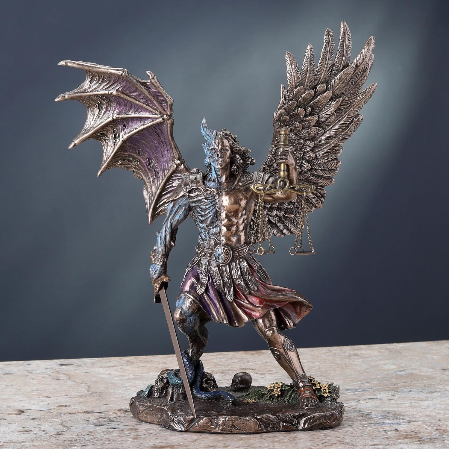 The statue of the Nephilim holding sword and scale, created by Veronese Design using finest resin and cold cast bronze technique