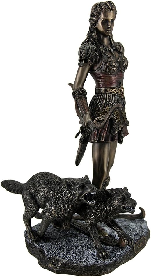No ordinary goddess, Skadi comes from Norse mythology and she has a connection with skiing, mountains, winter, and hunting with a bow. The sculpture has been crafted in great detail allowing you to see all the intricacies in her armor, bringing her and the two wolves who accompany her to life. The figure is finished in metallic bronze and hand painted with red tints, bringing out the depth and shadows of this great Viking huntress. She is pictured holding her bow and arrow and standing on skis. The statue is a fabulous gift for anyone who is into mythology or fantasy art, or for a woman who is a warrior at heart.