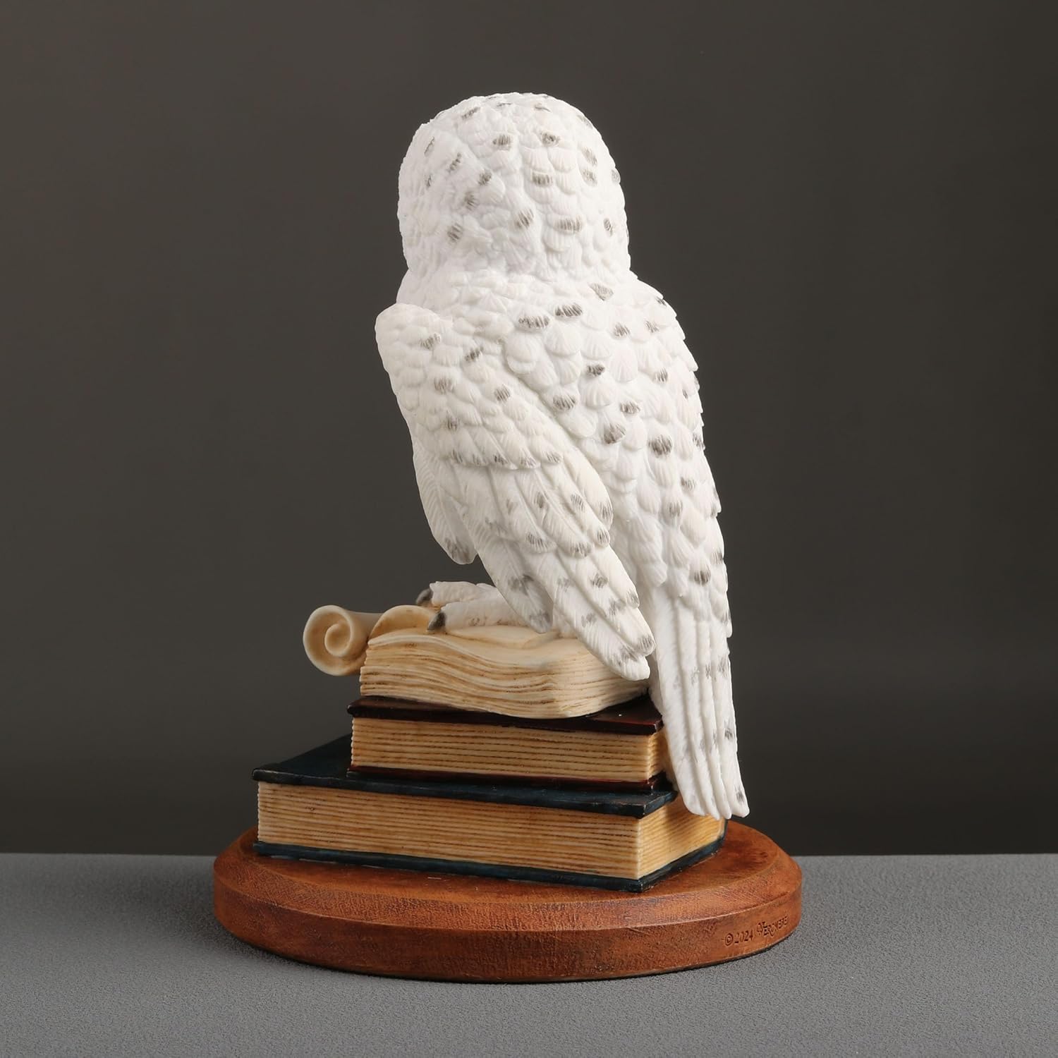 Featuring a snowy owl scholar scripting on a stack of books.