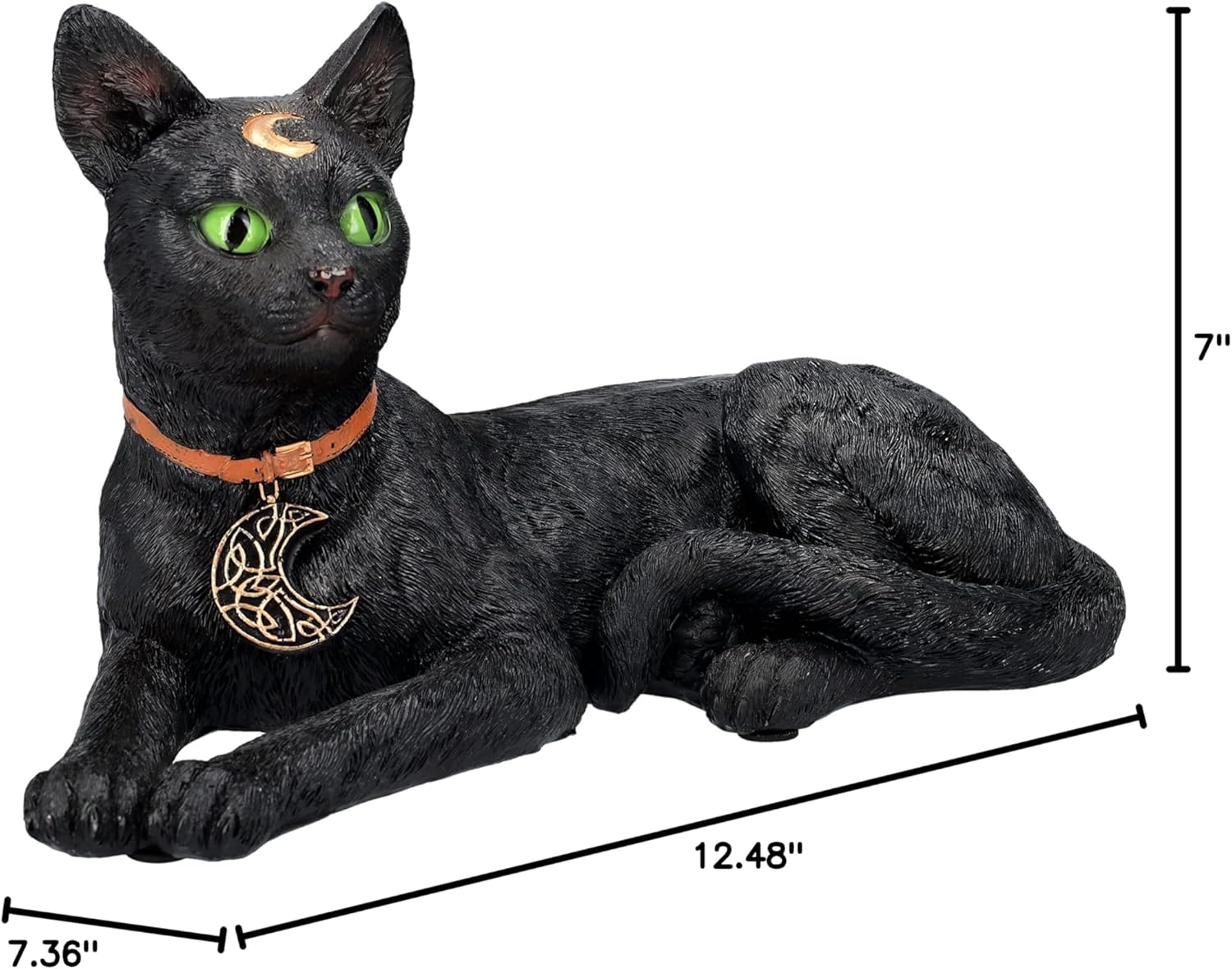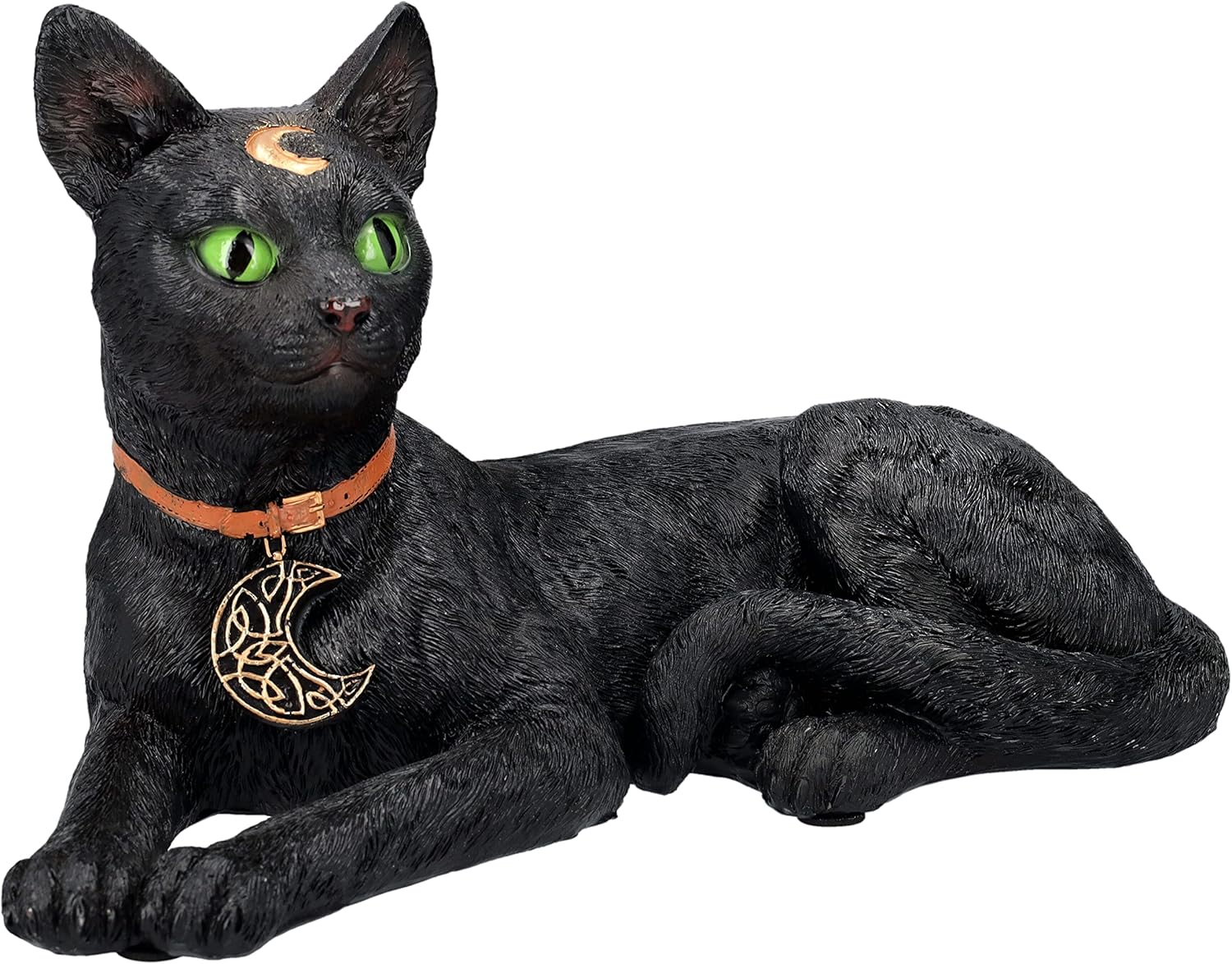 Realistic Black Cat Laying Sculpture with Crescent Moon and Wicca Charm 7” Tall