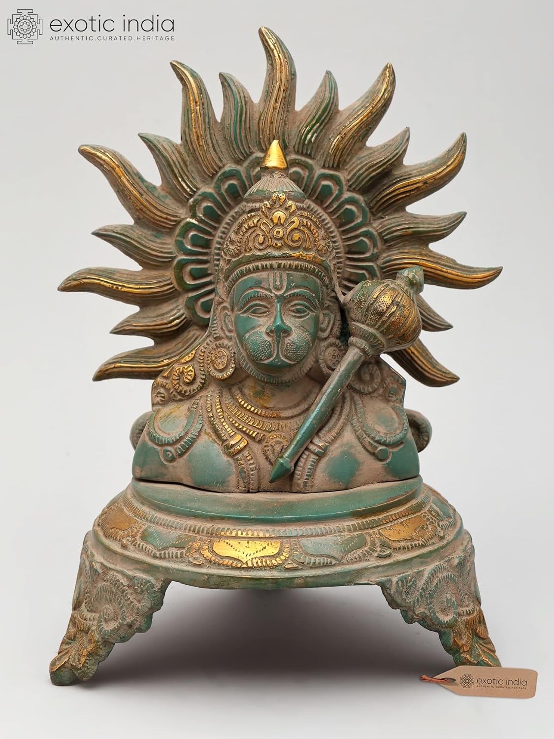 Exotic India Art Pvt. Ltd. this exquisite brass rendition of Lord Hanuman, a deity revered throughout India for his unparalleled strength, unwavering devotion, and profound wisdom. This statue, crafted with meticulous detail in India, captures the very essence of the Vanara prince, the steadfast servant of Lord Rama. The artist has masterfully depicted Hanuman in a powerful bust form, seated upon an ornate pedestal, his gaze serene yet resolute. The rich, aged patina of the brass lends a timeless quality to this divine artifact, with hints of verdigris and burnished gold creating a captivating visual texture. Hanuman's iconic mace, the formidable Gada, rests by his side, a symbol of his immense power and his role as a protector against evil. The elaborate headdress and sacred markings adorning his brow speak of his divine lineage and spiritual significance. The radiant halo of sun-like rays emanating from behind his head further accentuates his divine status, symbolizing his enlightenment and his connection to the celestial. The veneration of Hanuman stretches back to ancient epics, most notably the Ramayana. He is celebrated for his incredible feats of courage, including his flight across the ocean to Lanka to find Sita, his miraculous leap to retrieve the Sanjeevani herb to save Lakshmana, and his unwavering loyalty to Lord Rama. His divine strength was a gift bestowed by the wind god, Vayu, hence his name, meaning "son of Vayu." This statue serves as a tangible reminder of these heroic narratives, inviting contemplation on the virtues of selfless service, courage in the face of adversity, and the boundless power of faith.