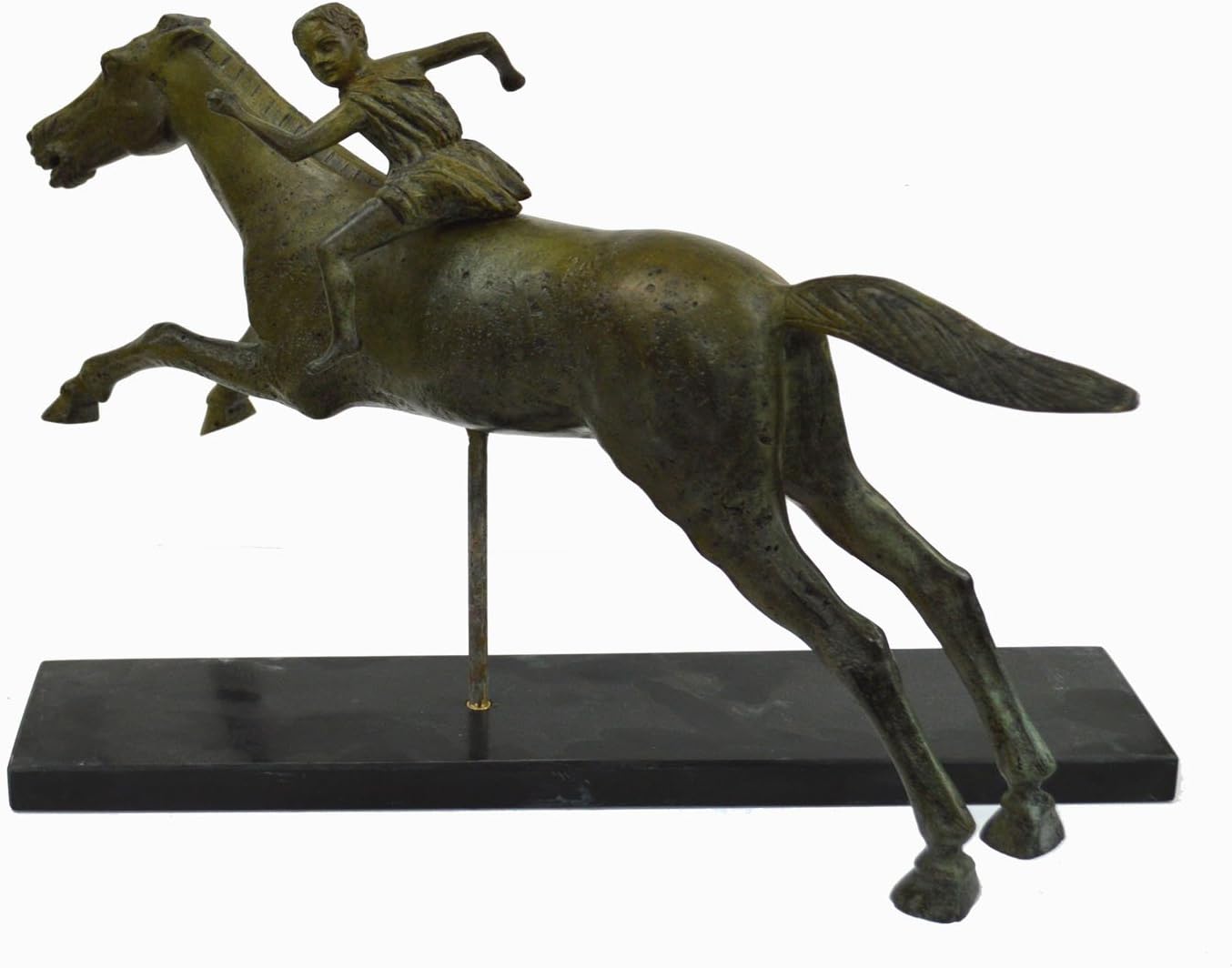 The Jockey of Artemision is a large Hellenistic bronze statue of a young boy riding a horse, dated to around 150–140 BC. It is a rare surviving original bronze statue from Ancient Greece and a rare example in Greek sculpture of a racehorse. Height: 31cm - 12.2 inches - Width: 52cm - 20.4 inches - Length: 10cm - 3.9 inches. Material: Pure Bronze Item.31555