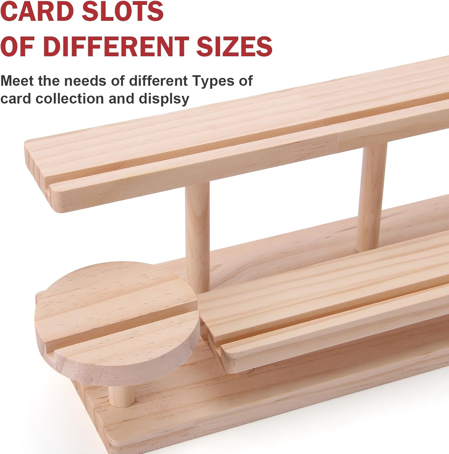 Find a beautiful home for your precious card collection. This three-layer wooden trading card display stand is carefully crafted with high-quality solid wood, retaining the natural wood grain and calm tones, presenting a unique combination of retro and modern craftsmanship. Whether you collect sports cards, basketball cards, volleyball cards or other trading cards, our card display stand can present your cards at the most elegant angle, exuding the visual charm of professional collection level. The universal trading card display stand measures 17.3" (length) × 5.9" (width) × 5.3" (height), and is equipped with a 3-layer stepped display structure, which can display up to 10 cards, so that each card has an independent perspective, without obstruction or crowding. The card slot has a deep edge slot design that can firmly support different types of card boxes to prevent slipping or tipping, ensuring safe and stable display. In order to meet a variety of collection needs, this wooden baseball card display stand is compatible with a variety of standard card sizes, including most common magnetic hard shell card boxes, standard packaged cards and ordinary TCG cards. Not only limited to card collection, this graded card display is also suitable for displaying postcards, business cards, badges, small accessories, etc., and is widely used in home study rooms, offices, retail stores, exhibition booths and other scenes.