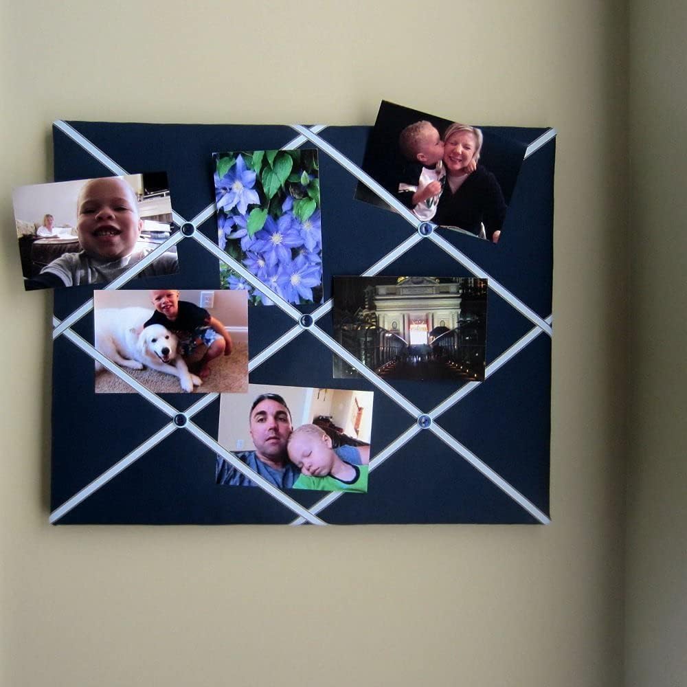 This 16x20 memory board is perfect for a boy! The fabric is navy blue and the ribbon is a pale blue with a dark stitching on the sides. The buttons are covered in a matching navy blue fabric. Handmade fabric memory boards are designed to be used without tacks or push pins. Great for: *Organizing photographs (your own or all those Christmas photo cards!) *Organizing business cards *Hanging hair accessories or jewelry *Safely storing your household bills *Organizing the million slips of paper covering your desk! This memory board is made with designer fabrics and top quality materials. The back is finished with a felt back and ribbon. Each memory board has a saw tooth hanger on the vertical and horizontal sides. Because each memory board is made to order fabric placement may vary.