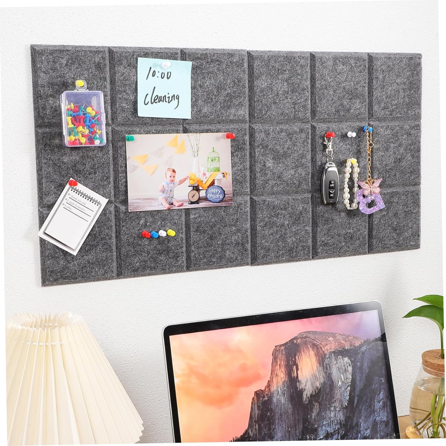 Package Include 8 x felt tiles 50 x pins Characteristics -Colorful pins included: comes with multiple colorful pins that not only serve a functional purpose but also add a decorative touch to your board felt tiles for wall -Color:Dark Grey felt board for wall -Large size: measuring a large size each tile, this felt board provides ample space to pin notes, photos, and memos, making it ideal for various uses bulletin board -Self adhesive design: the adhesive backing allows easy installation and a , preventing the felt board from falling large felt board -Material:Felt bulletin boards -Versatile use: suitable for office, craft, and study environments, this felt board can be used to organize tasks, display pictures, or keep important reminders bulletin board squares -Size:30.00X30.00X0.80cm/11.79X11.79X0.31in board for wall -Strong material: made from felt, this pin board is and resistant to deformation, ensuring use felt wall tilesGoods Informationfelt board tiles for wall These self-adhesive tiles are easy to install on any wall.small cork board The set includes felt tiles and colorful pins, ideal for organizing memos, photos, and important notes.bulletin boards for walls Transform your office or home workspace with our felt pin board tiles