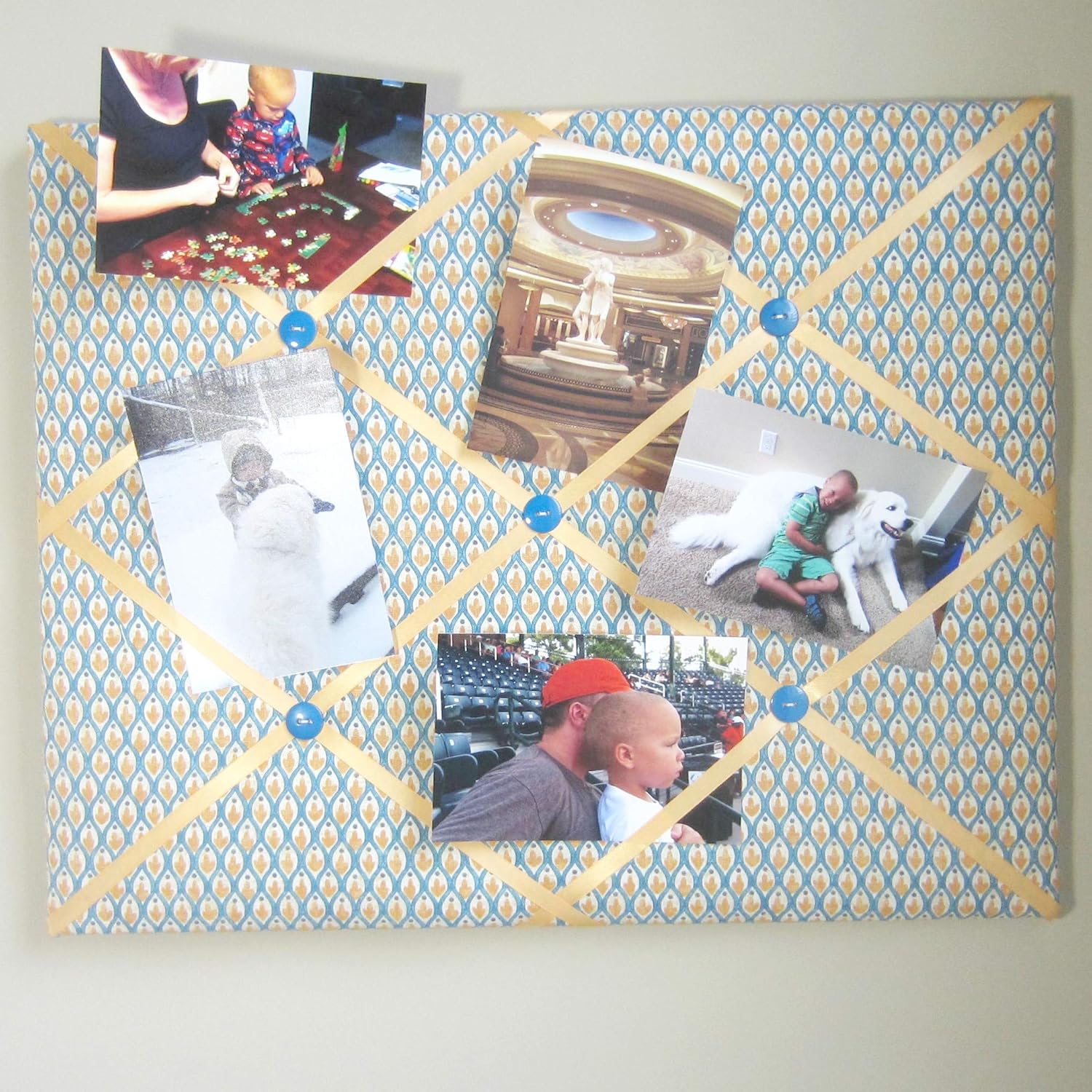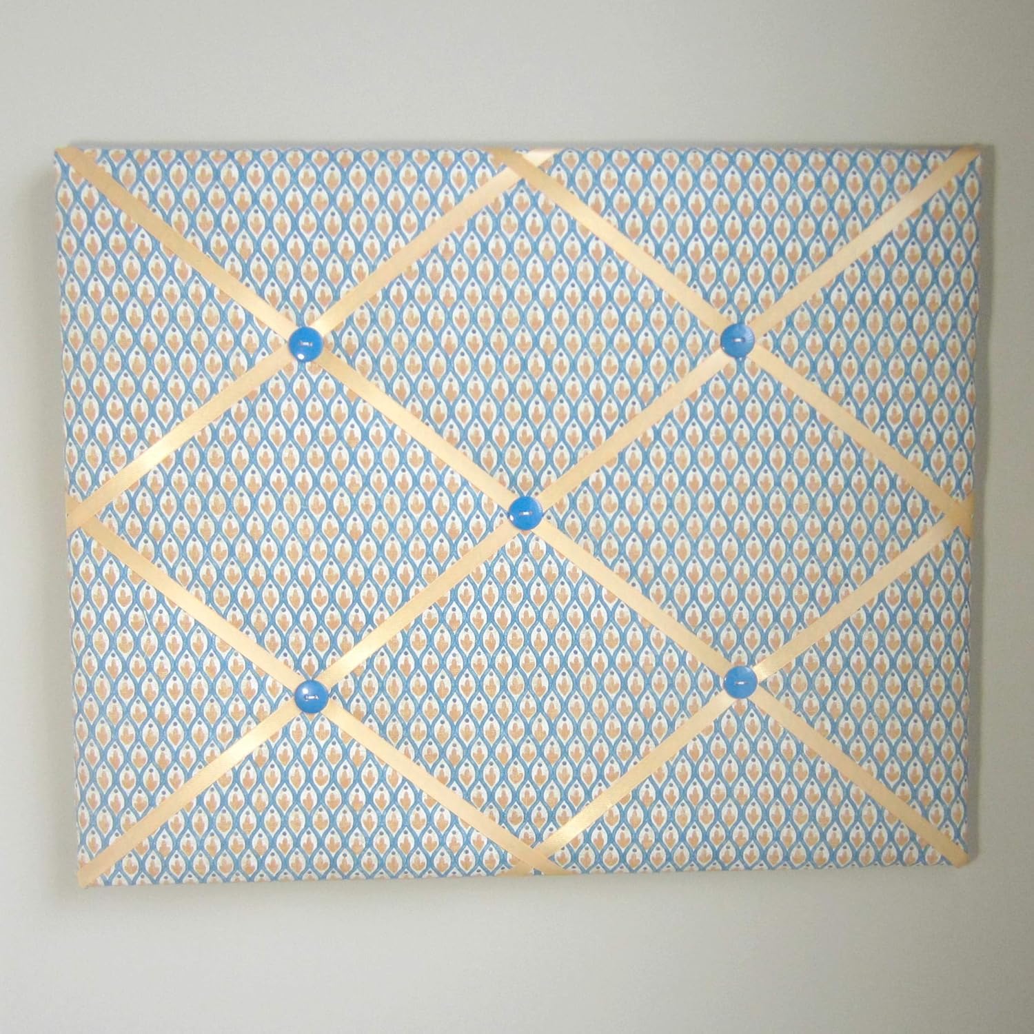 This 16"x20" memory board is one of my favorites. The fabric is a cheerful blue with a smidge of golden yellow. The gold satin ribbon brings out the gold in the fabric and the buttons in blue finish it off. Handmade fabric memory boards are designed to be used without tacks or push pins. Great for: *Organizing photographs (your own or all those Christmas photo cards!) *Organizing business cards *Hanging hair accessories or jewelry *Safely storing your household bills *Organizing the million slips of paper covering your desk! This memory board is made with designer fabrics and top quality materials. The back is finished with a felt back and ribbon. Each memory board has a saw tooth hanger on the vertical and horizontal sides. Due to the many variations in monitors and browsers, color samples may appear different on different monitors. Computer monitors are not all calibrated equally and color reproduction on the Internet is not precise. Since it is not possible to guarantee our online colors will look the same on all computers, we do not guarantee that what you see accurately portrays the color of the actual product